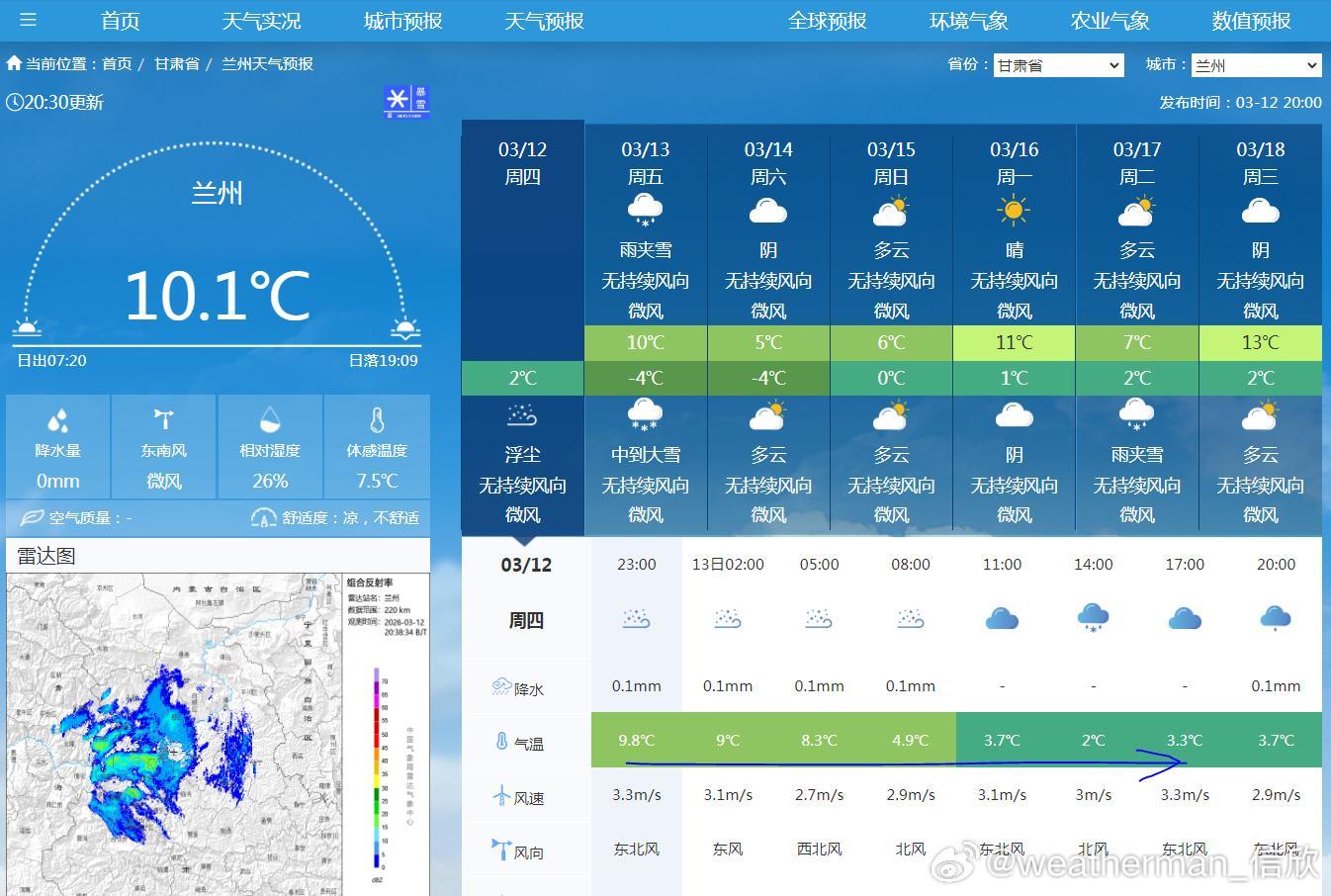 【气温波动】今天在冷空气到来前,呼和浩特老国家站15.8℃,重庆沙坪坝26.3℃,创出今年气温新高。明天包括重庆在内,南方多地气温还处于高位,但青海东部、甘肃南部和东部、宁夏南部、内蒙古多地,降温会超10℃。兰州明天气温可能倒降,今晚预报的12日20时-13日20时最高10℃,其实就是今晚气温,明天下午可能就2-3℃。