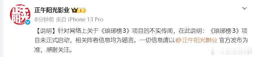 正午阳光辟谣琅琊榜3阵容信息正午阳光称琅琊榜3未正式启动 12日,网传琅琊榜3吴磊换张凌赫,引发热议。发博回应:“《琅琊榜3》项目未正式启动,相关阵容信息均为谣言。”