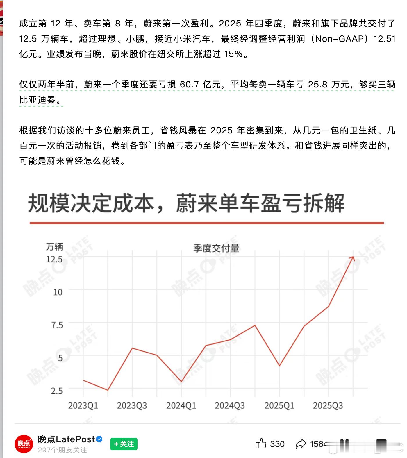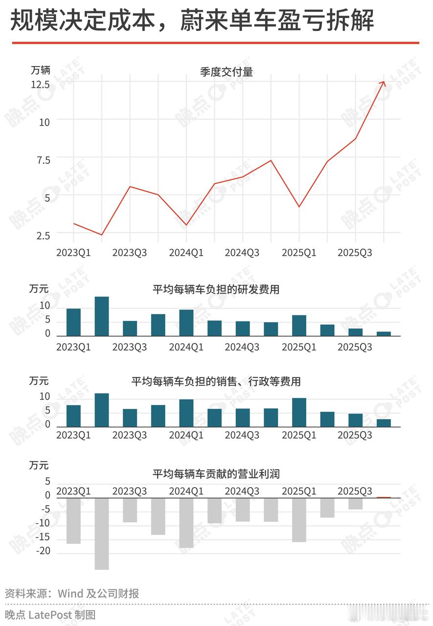"仅仅两年半前,蔚来一个季度还要亏损 60.7 亿元,平均每卖一辆车亏 25.8 万元,够买三辆比亚迪秦。"