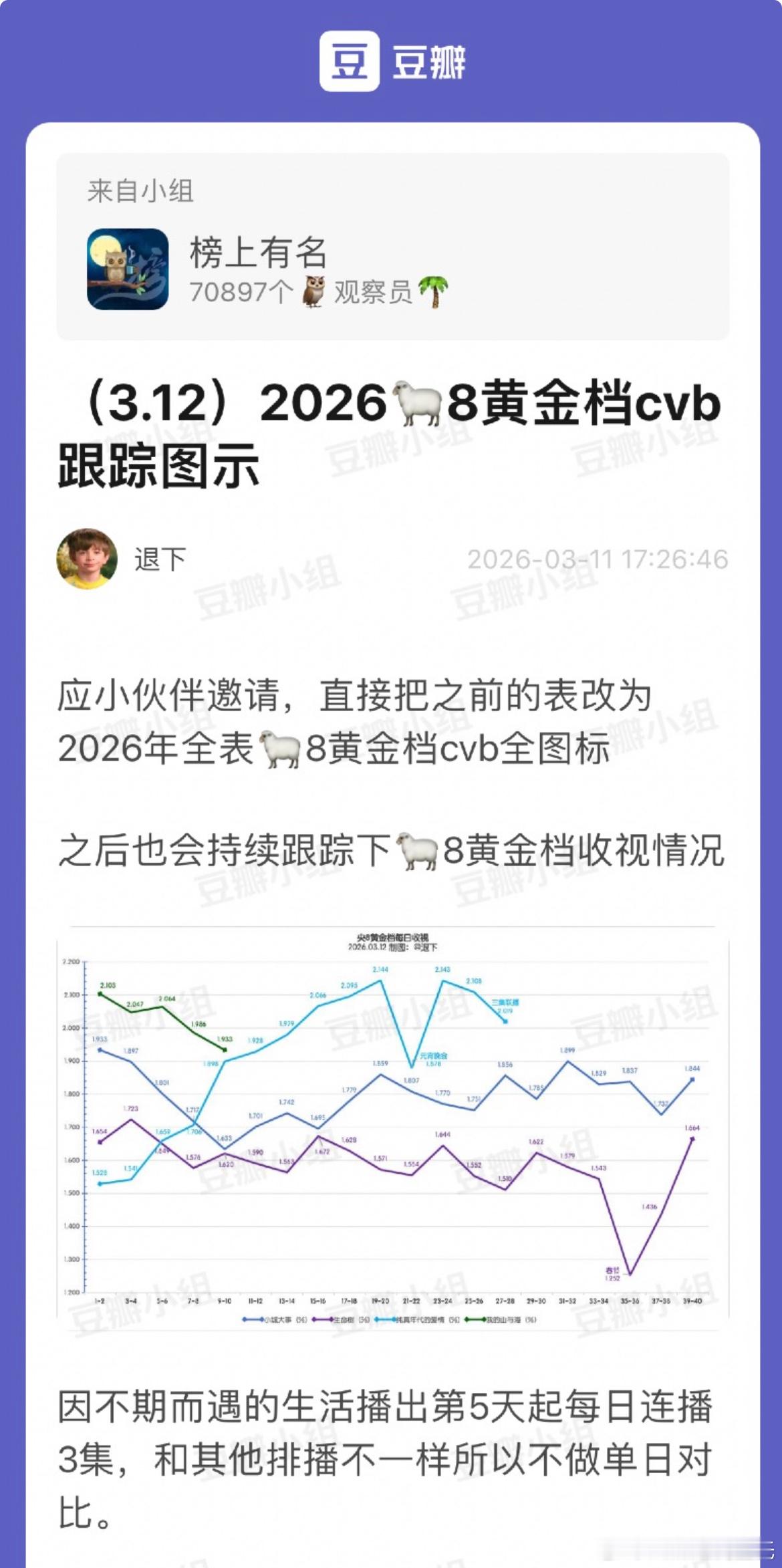2026央八CVB收视率走势可以很清晰看到《生命树》从没超过《小城大事》,哈哈,嘲丽的时候肯定没想过回旋镖