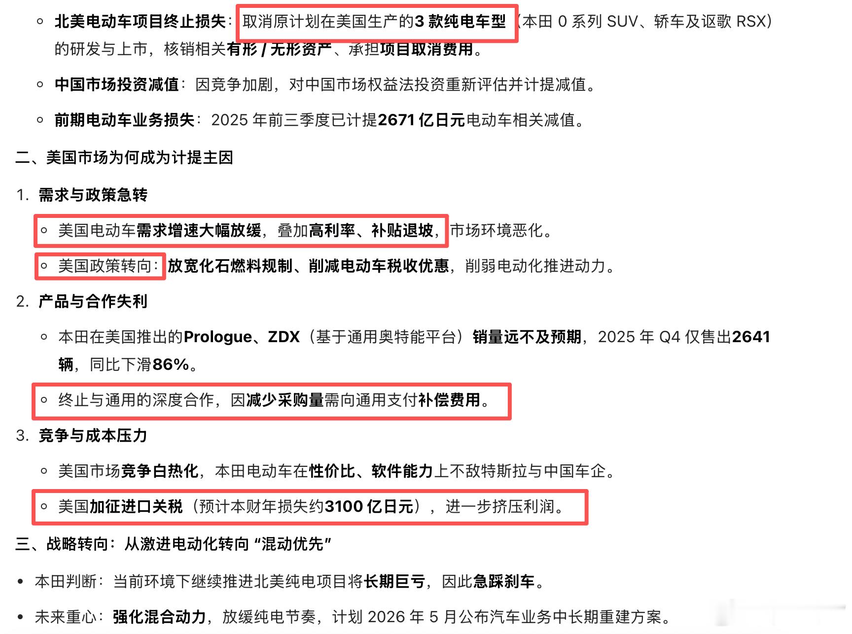 本田此次巨额计提(最高2.5万亿日元,约1082亿元人民币),核心原因正是美国电动车市场遇冷、战略转向而产生的资产减值与项目损失。