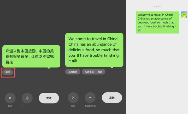 3、语音转文字翻译:当你发送语音时左下角有一个翻译按钮,支持 18 种语言互译,可以直接把语音翻译成对方的文字。