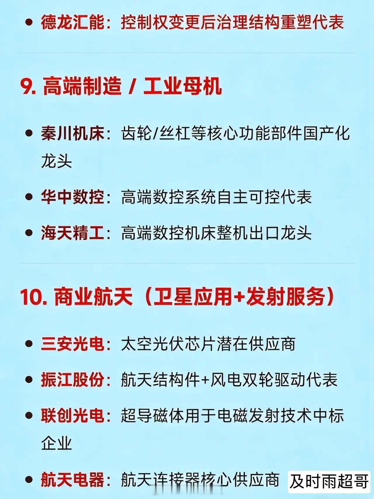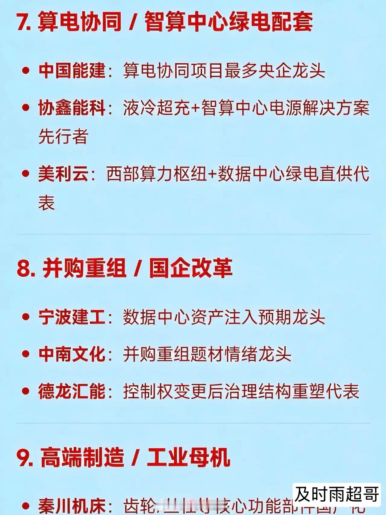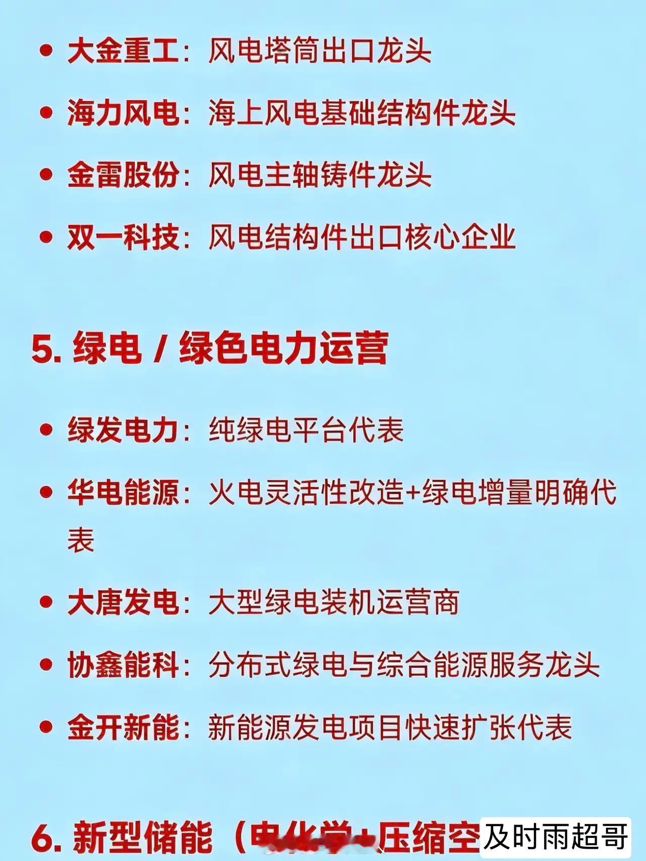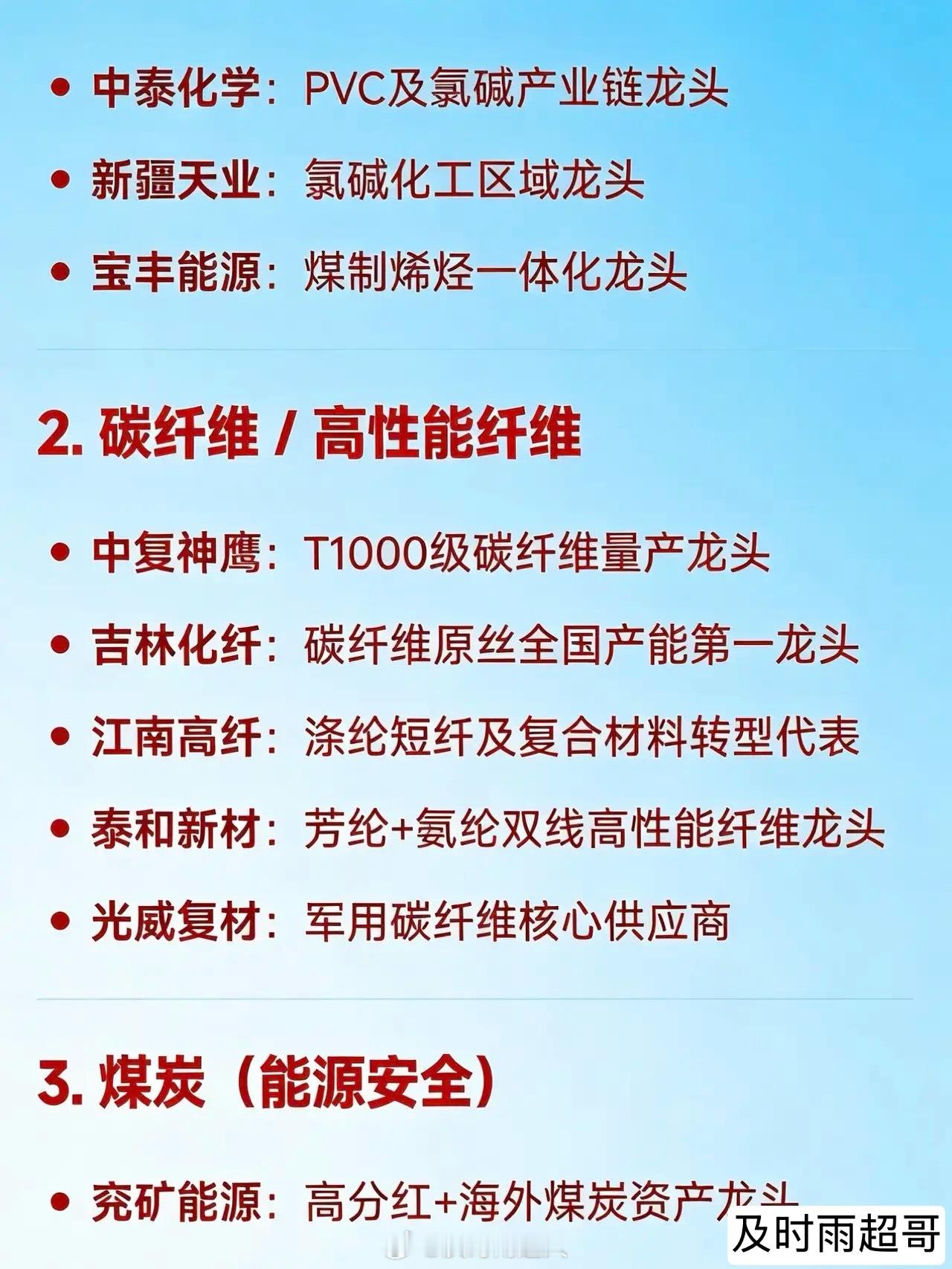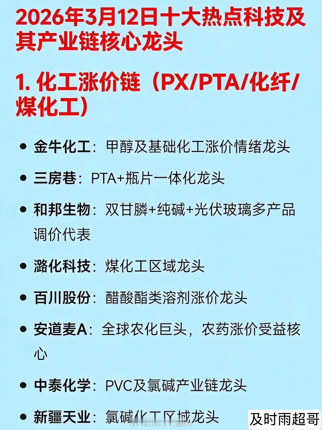 2026年3月12日十大热点科技及其产业链核心龙头1. 化工涨价链(PX/PTA/化纤/煤化工)金牛化工:甲醇及基础化工涨价情绪引领者三房巷:PTA+瓶片一体化领军企业和邦生物:双甘膦+纯碱+光伏玻璃多产品调价典型代表潞化科技:煤化工区域龙头企业百川股份:醋酸酯类溶剂涨价龙头安道麦A:全球农化巨头,农药涨价核心受益方中泰化学:PVC及氯碱产业链龙头新疆天业:氯碱化工区域龙头宝丰能源:煤制烯烃一体化龙头2. 碳纤维 / 高性能纤维中复神鹰:T1000级碳纤维量产龙头吉林化纤:碳纤维原丝全国产能第一企业江南高纤:涤纶短纤及复合材料转型典型泰和新材:芳纶+氨纶双线高性能纤维龙头光威复材:军用碳纤维核心供应商3. 煤炭(能源安全)兖矿能源:高分红+海外煤炭资产龙头郑州煤电:区域火电保供+煤炭弹性标的中煤能源:煤电一体化央企龙头陕西黑猫:焦化副产品涨价受益代表4. 风电(整机+海风+零部件出口)节能风电:央企风电运营龙头明阳智能:海上风电整机出海龙头金风科技:全球陆上风电整机龙头东方电缆:海缆环节绝对龙头大金重工:风电塔筒出口龙头海力风电:海上风电基础结构件龙头金雷股份:风电主轴铸件龙头双一科技:风电结构件出口核心企业5. 绿电 / 绿色电力运营绿发电力:纯绿电平台代表华电能源:火电灵活性改造+绿电增量明确代表大唐发电:大型绿电装机运营商协鑫能科:分布式绿电与综合能源服务龙头金开新能:新能源发电项目快速扩张代表6. 新型储能(电化学+压缩空气+系统集成)纳百川:户储逆变器新锐龙头正泰电源:工商业储能系统集成龙头阳光电源:全球储能变流器龙头宁德时代:动力电池+大型储能电芯龙头派能科技:户用储能电池系统龙头鹏辉能源:储能电池多元化应用代表德业股份:微型逆变器+储能逆变器双轮驱动龙头7. 算电协同 / 智算中心绿电配套中国能建:算电协同项目最多央企龙头协鑫能科:液冷超充+智算中心电源解决方案先行者美利云:西部算力枢纽+数据中心绿电直供代表8. 并购重组 / 国企改革预期宁波建工:数据中心资产注入预期龙头中南文化:并购重组题材情绪龙头德龙汇能:控制权变更后治理结构重塑代表9. 高端制造 / 工业母机秦川机床:齿轮/丝杠等核心功能部件国产化龙头华中数控:高端数控系统自主可控代表海天精工:高端数控机床整机出口龙头10. 商业航天(卫星应用+发射服务)三安光电:太空光伏芯片潜在供应商振江股份:航天结构件+风电双轮驱动代表联创光电:超导磁体用于电磁发射技术中标企业航天电器:航天连接器核心供应商