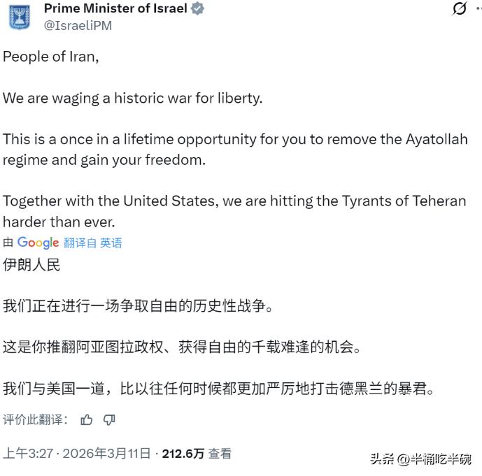 以色列总理又“发疯”了! 3月11日,以色列总理官方社交账号发文直接喊话伊朗民众