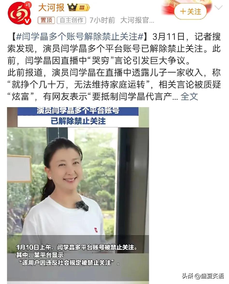 闫学晶解封了, 但她还是开心不起来, 不是因为观众不买账,而是因为她的账号只解封了一半。 闫学晶的账号最近确实解除了禁止关注,很多人以为已经完全解封,其实并不是。目前她的账号只是恢复了基础浏览和关注功能,直播、带货橱窗这些核心功能都还没重启,评论区也设置了门槛,需要关注满100天才能留言,整体还处在严格受限的状态。平台这次是分阶段处理,属于半解封,还在观察期。 很多人看到这里可能会有点疑惑:既然都解封了,为什么还要“留一手”?其实这就是现在平台常见的一种处理方式。账号不直接恢复全部权限,而是先给一点空间,看一段时间的表现,再决定要不要完全放开。说白了,这更像是一种试运行。 从平台的角度看,这样做其实也不难理解。如今短视频平台对账号管理越来越严格,尤其是有过争议或者违规记录的账号,一下子全部恢复权限,风险确实不小。先恢复浏览、关注这些基础功能,让账号重新回到正常状态,但涉及流量变现的直播、带货等环节,就会格外谨慎。 再往深一点看,这件事其实折射出一个挺现实的问题:现在很多明星、演员把事业重心放到了短视频平台上。演戏之外,直播、带货、账号运营,几乎成了新的收入渠道。一旦账号出问题,影响的不只是曝光度,还有背后的商业价值。 闫学晶其实算是比较有观众基础的演员。早些年演的很多角色都挺接地气,东北喜剧风格也有不少人喜欢。问题就在于,传统演员进入短视频生态之后,规则完全变了。以前靠作品说话,现在还得适应平台规则、流量逻辑、内容节奏。只要一步没走稳,账号可能就会受到影响。 不少网友这次也看出来了,所谓“解封”,其实并不是一句话的事。权限恢复、流量恢复、商业能力恢复,都是不同阶段。有的账号解封之后,很快又恢复热度;也有的账号虽然解封了,但流量再也回不到从前。 所以闫学晶现在的状态,其实更像站在一个十字路口。账号算是回来了,但真正能不能回到以前的影响力,还得看接下来一段时间的表现。内容怎么做,节奏怎么把握,能不能重新赢回观众,这些才是关键。 互联网从来不缺机会,但也从来不给谁永久的舞台。 账号可以重新开始,但观众的耐心是有限的。 你觉得闫学晶这次还有机会彻底翻回来吗?评论区说说你的看法。