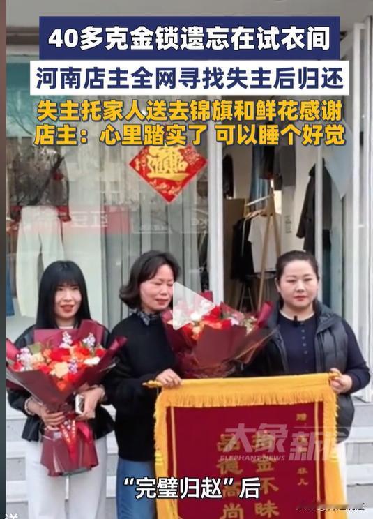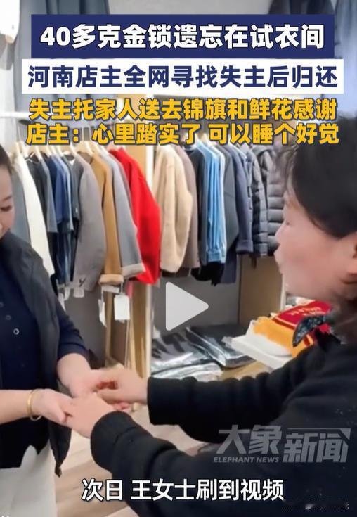 意外之财!河南,一服装店的店主,捡到一个40多克的金锁,价值5 万多!可店主一点都开心不起来,愁了好几天睡不着。她放下手上的生意,拍视频发到网上找失主。一直到亲手把金锁送还给失主,才松了一口气。网友说“人心的分量远比金子重。” 事情发生在河南的一家服装店,店主像往常一样开门做生意,接待一波又一波来挑衣服的客户。 傍晚她在收拾试衣间的时候,发现了角落里一个金灿灿的金锁。店主拿起来放在手里掂量着分量,就知道价格不菲。 她的第一反应不是盘算着这个金锁能卖多少钱,而是发愁怎么才能找到金锁的主人。 店主马上打开监控视频,看看是谁落下的。 没想到监控的角度有限,只拍到了客人进试衣间的模糊背影,根本看不清长相,也不知道这金锁是什么时间落在试衣间的,是谁落下的,毕竟试衣间是没有监控的。 有店员劝店主说,反正也没人看见,就算捡来的呗,自己留着或者卖掉多一笔收入。 可店主却摇头说,不是自己的东西,拿着心里很不踏实,而且人家丢了这么贵的东西,肯定也是吃不下睡不着,自己不能干这种昧良心的事。 等了好几天,都没有失主主动来店里问金锁的事。于是店主把金锁拍了个视频,发到网上全网寻找失主。 店主她放下手里的生意,拍视频发朋友圈,把金锁丢失的细节拍得清清楚楚。 她还拜托身边的朋友和同城的网友能帮忙转发。 视频在网上也传了好几天,终于有了消息。 一位女士在看到视频后,立马联系了店主,准确说出了金锁的样式重量,甚至还能回想起自己那天试穿衣服的时间和款式。 一件件细节都能对得上,这时店主的心终于放下来了。 为了确保万无一失,她又和这位女士反复核对当天细节,确认对方就是真正的失主后,才约了时间让对方过来店里取金锁。 丢失金锁的女士赶到服装店的时候,眼眶都是红的。 她跟店主说,这枚金锁是家里人送的,非常重要,平时一直戴在身上。那天是因为自己要试衣服,所以把它摘下来放在试衣间的凳子上,出门的时候就忘记了。 回到家还没发现金锁丢了,是刷到店主的视频,才发现脖子上的金锁不见了,着急得很。 店主义无反顾的把金锁交还给了失主。 没过几天,失主便给店主送来了锦旗和鲜花。红彤彤的锦旗上写着感谢的话语。 面对这份感谢,店主只是笑着说都是小事,把东西还回去,自己心里也踏实了,终于能睡个好觉了。 从法律的角度来说,这位店主的归还行为不仅是善良,更是法定的义务。 根据《民法典》第三百一十四条规定:拾得遗失物,应当返还权利人。拾得人应当及时通知权利人领取,或者送交公安等有关部门。 简单来说,就是捡到别人丢的东西,不管值多少钱,都必须还,这不是情分,而是本分。 如果捡到遗失物拒不归还,甚至故意隐匿、变卖,失主有权要求返还财物,要是数额较大,还可能涉嫌侵占罪,要承担相应的法律责任。 这枚 40 多克的金锁,价值数万元,如果店主拒不归还,失主可以通过法律途径维权,店主不仅要返还金锁,还可能面临法律的处罚。 说白了,捡到东西归还是天经地义的事,既对得起自己的良心,也符合法律的规定。 这位河南店主的选择,既守住了良心的底线,也遵守了法律的要求,这样的实在人,值得所有人为她点赞。 如果换做是你,在试衣间捡到价值数万的金锁,你会做出怎样的选择?