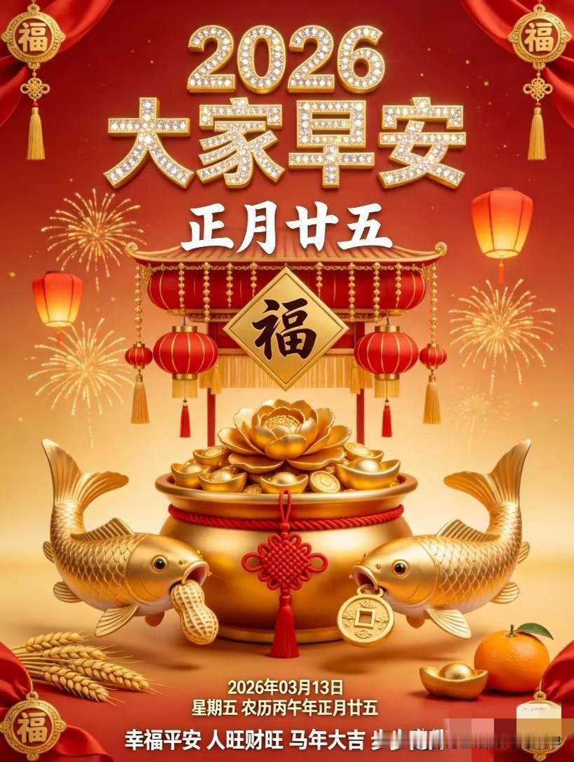 正月二十五,周五早安! 愿你今天顺心顺意、轻松自在,把一周的疲惫都放下,把好心情装满口袋~ 正月二十五,周五早安! 风轻云淡,心有暖阳, 愿你事事顺心,步步欢喜, 平安喜乐常相伴,好运一路不打烊。 正月二十五,早安周五! 新的一天,新的开始, 愿生活温柔以待, 工作顺利,心情舒畅, 所愿皆所得,所行皆坦途。  正月二十五,周五安康! 日子慢慢走,美好悄悄来, 愿你眼里有光,心中有爱, 三餐四季皆安稳,岁岁年年皆顺遂。 正月二十五,周五吉祥! 一周将尽,好运将至, 愿你烦恼清零,快乐加倍, 平安健康,万事胜意。 周五早安 正月二十五