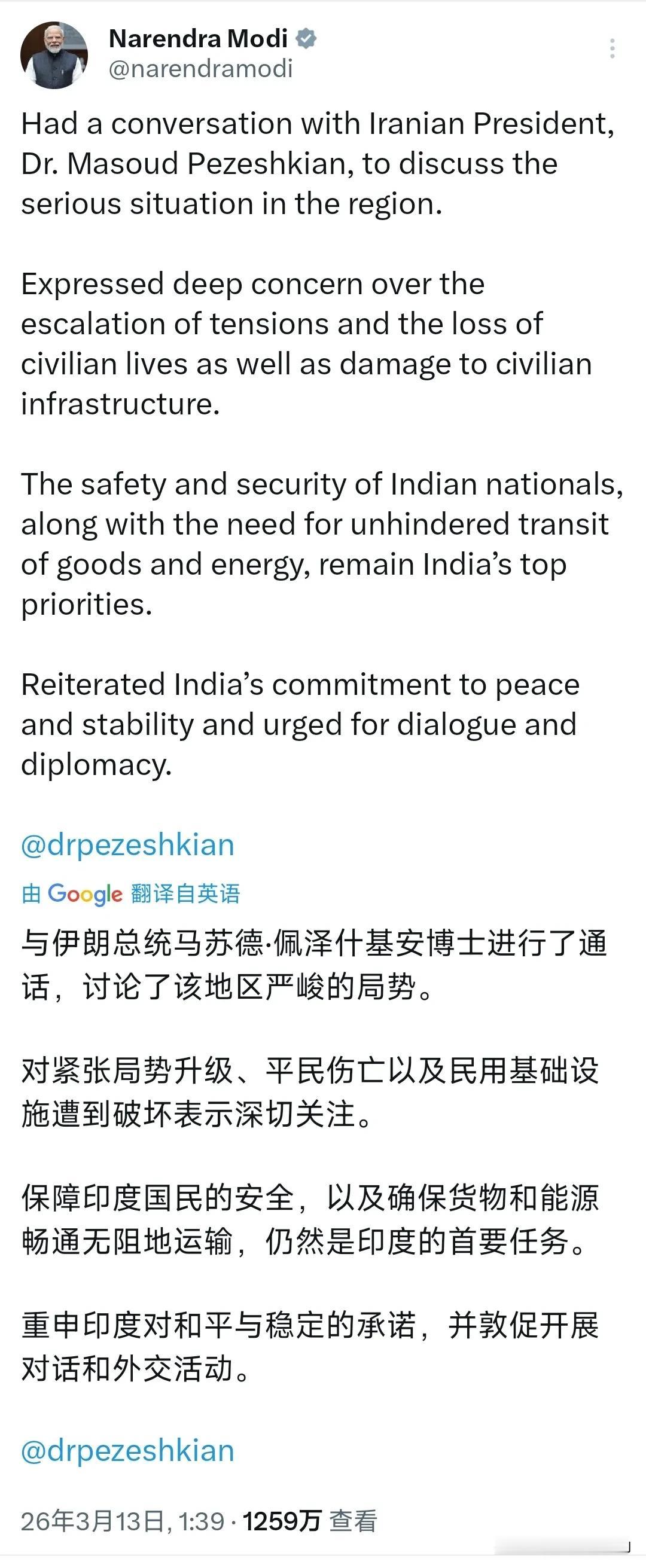 印度总理莫迪今天(北京时间3月13日)写道:“与伊朗总统马苏德·佩泽什基安进行了通话,讨论了该地区严峻的局势。对紧张局势升级,平民伤亡以及民用基础设施遭到破坏表示深切关注。保障印度国民的安全,以及确保货物和能源畅通无阻地运输,仍然是印度的首要任务。重申印度对和平与稳定的承诺,并敦促开展对话和外交活动。” 评几句 莫迪这通电话打得颇为微妙。表面上是"深切关注"地区局势、呼吁和平,实则字里行间处处是印度的精明算计——"保障国民安全"是底线,"确保能源畅通"才是核心诉求。 新德里对中东乱局的态度向来务实得近乎冷酷:既不站队伊朗,也不得罪以色列,更不想因霍尔木兹海峡的任何闪失而断了自家的能源命脉。这种"骑墙式关切"背后,是印度作为第三大石油进口国对地缘政治风险的极度敏感。 所谓"敦促对话外交",翻译过来就是:你们打归打,但别挡了印度的能源通道,也别危及在那片地区讨生活的印度侨民。至于谁是正义一方、谁该为平民伤亡负责?莫迪选择性地保持了战略模糊。这种"精致的利己主义",正是他在乱局中求存的典型姿态——声音要响亮,姿态要中立,利益要抓牢。