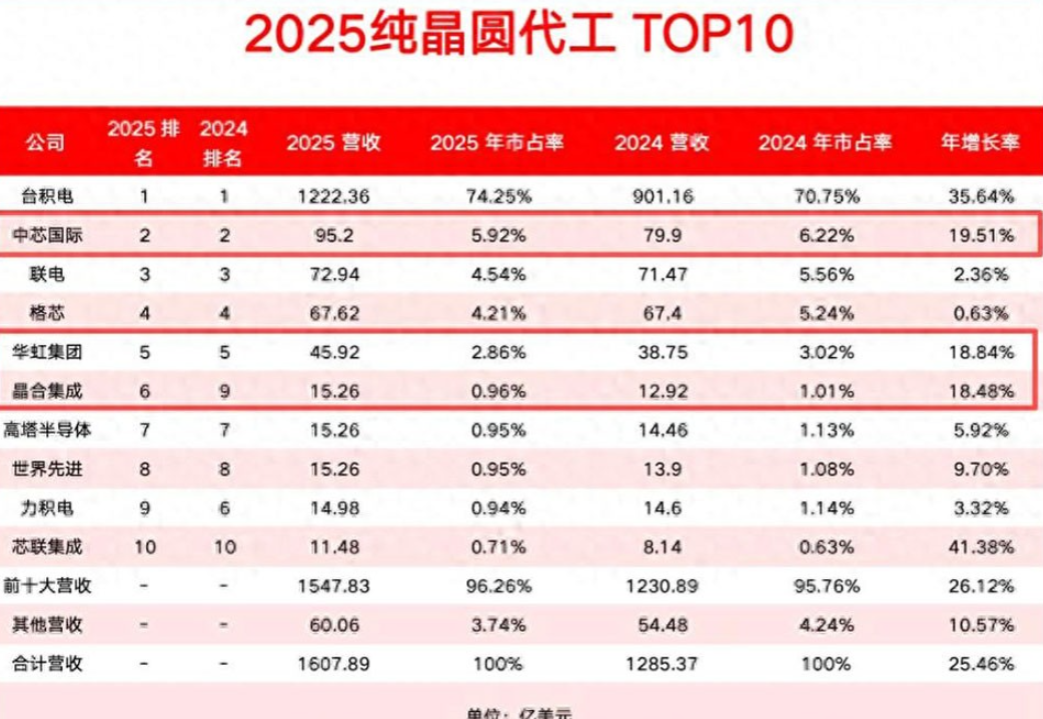 之所以年增长率会这么高,我们之前也介绍过,这三家代工企业2025年都处于超负荷运行状态。按业界普通说法,晶圆代工企业的产能利用率真超过90%就是超负荷。 而中芯国际2025年平均产能利用率高达93.5%,华虹集团2025年每个季度平均产能利用率都超过100%,甚至高达106.1%,还有晶合集成产能利用率也高达103%。 原因就是订单爆满,即使工厂满负荷运行,也不能满足需求,所以他们增长率都很高。