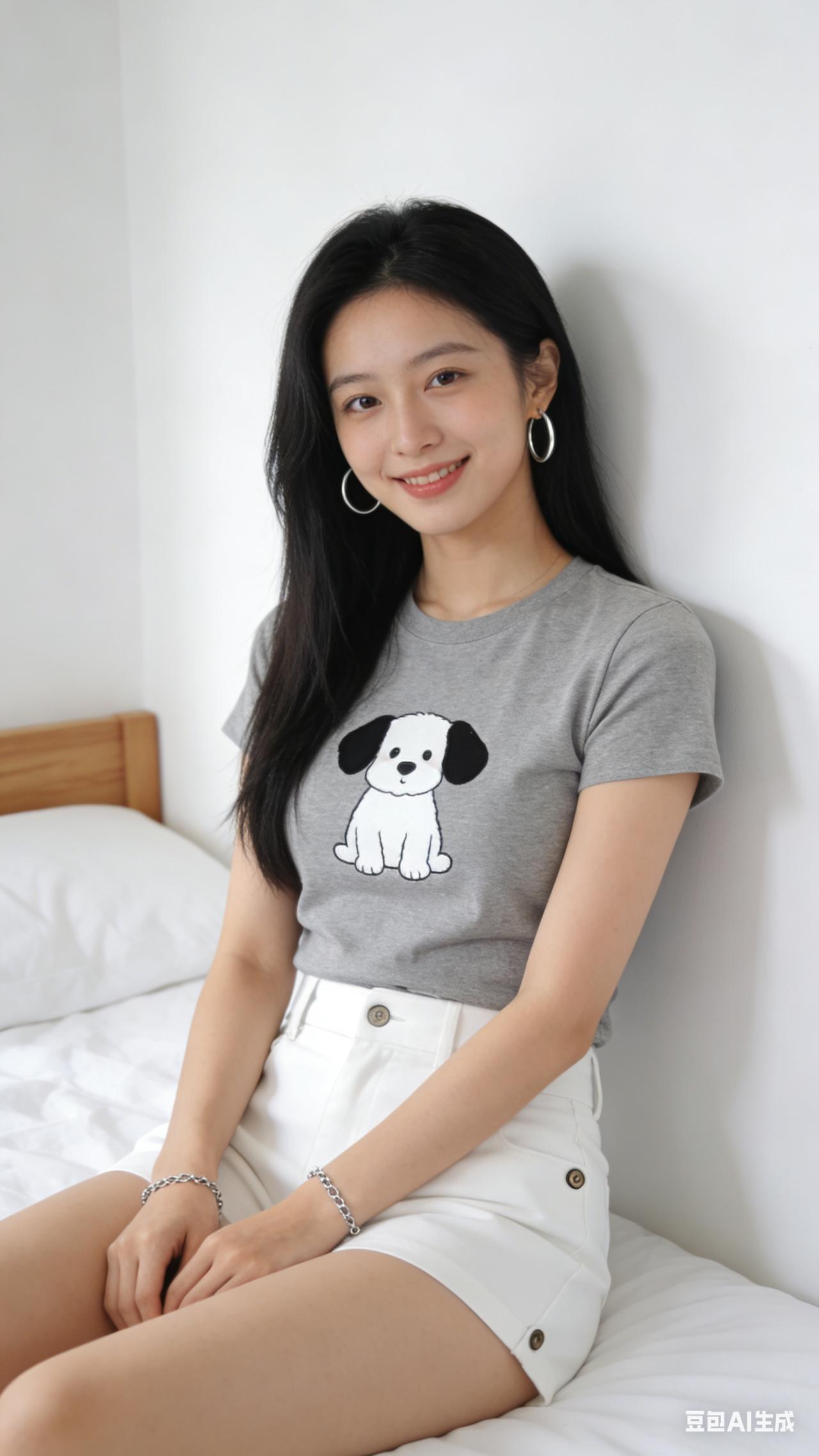 杰作,最佳画质,8K超精细,写实风格,一位20出头的漂亮中国女性,柔和五官,清澈明亮的眼睛,甜美笑容,顺滑黑色长发垂在肩头,优雅坐在白色床上,靠在素净白墙,穿着修身灰色纯棉T恤(胸前有一只白色身体、黑色耳朵的卡通小狗),高腰白色短裤(侧边有小纽扣细节),银色圆环耳环,双手佩戴细银链手链,侧方柔和漫射自然光,极简干净的卧室美学,背景可见浅白床品和木质床头板,温暖温柔的氛围,9:16竖屏构图,浅景深,细腻真实的皮肤纹理