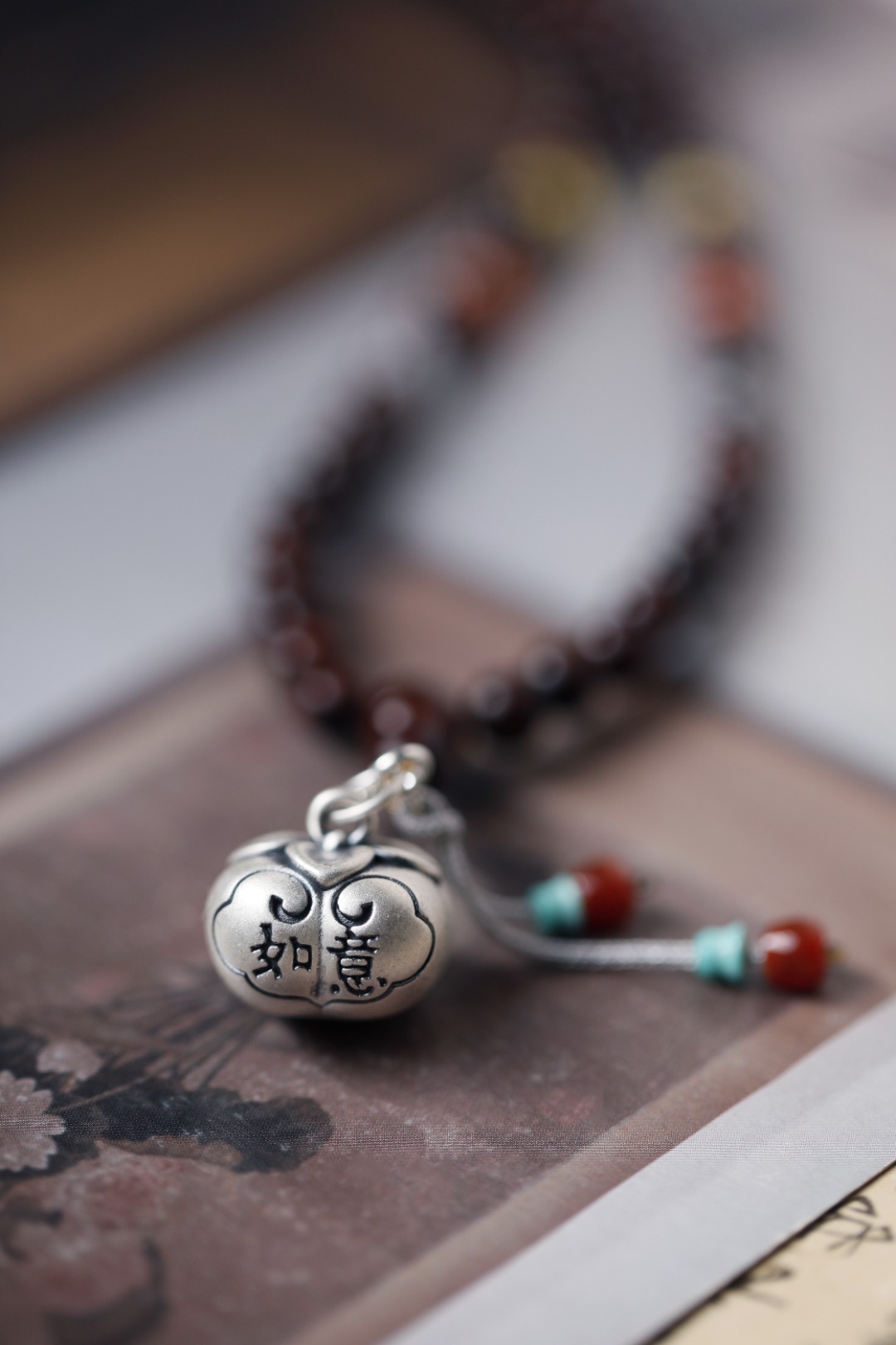 油梨老料油润光泽,形制高雅,其降香浓郁,不由为之折服;佩于腕间,显独特魅力。(银饰可拆卸)