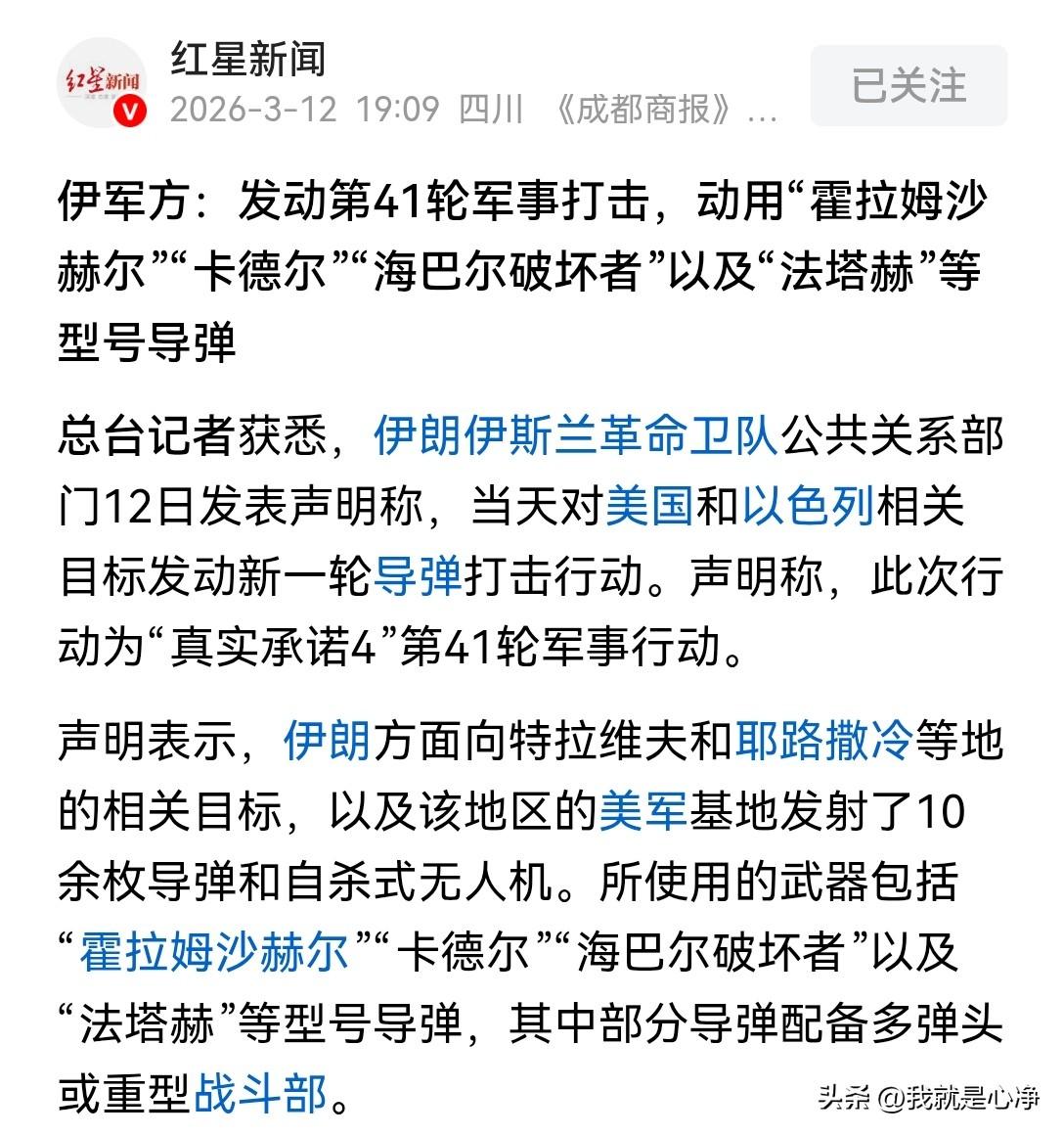 中东战争进入到了第14天,伊朗的反击居然到了第41轮 最新消息称,伊朗伊斯兰革命卫队发言人表示 12号当天,伊朗军方对美国和以色列的相关目标发动新一轮导弹打击行动 此次行动为真实承诺4第41轮军事行动 在该行动中,伊朗方面向特拉维夫还有耶路撒冷等地的相关目标以及该地区的美军基地发射了10余枚导弹,还有大批自杀式无人机 值得一提的是,这一部分导弹都配备了重型弹头或者多弹头 应该属于是最新型号的导弹 以目前伊朗的战争节奏来看的话,基本上和心净之前的预测是一样的 伊朗已经把过去陈旧的导弹型号差不多消耗殆尽了,去库存的任务已经基本上完成 未来伊朗将发动持续的、漫长的,但规模较小的重型导弹袭击活动 每天不用打太多,个位数的导弹就可以 也用不着每天都打两位数的导弹,个位数的导弹能够持续时间长了,也是一个不俗的战果啊 无人机也不用多,几十架就可以 像这样的产能,伊朗是绝对维持得住的 然后就活活把美国和以色列的力量拖死 让他们明白一点,战争不是他们想停就能停的 41轮军事打击已经来了,410轮还远吗?