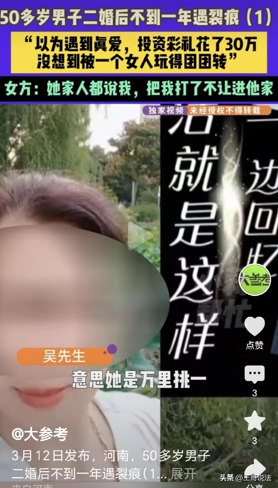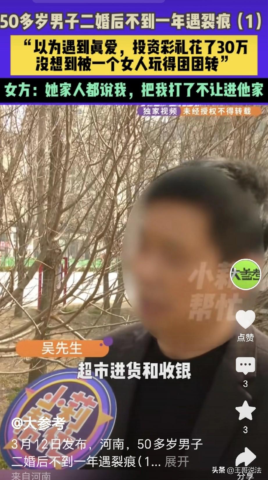 “我太傻了,被她玩的团团转!”一56岁男子丧偶,经人介绍认识一50岁离异女子,男子以为第二春来了,立刻给女子彩礼100100元,之后俩人结婚,男子抵押了房子,贷款几十万给女子在老家开了超市,可没想到,超市进货收银盈利,女子不让男子知道,男子过年要回家,女子只给他300元,光车加油就花了200,男子孩子要交学费,女子说不是她小孩她不管,男子崩溃! 吴先生照自己脸上连扇巴掌: 我觉得我太傻了,被一个女人玩的团团转! 原来吴先生56岁,经人介绍认识了50岁的女子,吴先生对她一见钟情,真心实意和她谈起了恋爱。 经过一番交往,吴先生对她非常的满意,他以为遇到了真爱,立刻给女子10万零100元。 这个数字,意味着万里挑一,俩人高高兴兴的结婚,可吴先生没有想到,麻烦接踵而来。 女子升级为了妻子,告诉吴先生她想在老家开个超市,吴先生毫不犹豫,立刻就把房子给抵押了出去。 他拿着几十万给妻子投资,可超市开好,吴先生发现,超市的进货收银以及盈利,妻子一律不让他管。 男子有些着急,他兜里空空,所有的钱都在超市里面。 他过年回家,妻子只给他300元,可是他开车出行,光加油就花走了200元。 男子急了,剩下100元能干什么?更可怕的还在后面,孩子开学,他问妻子要学费。 谁知妻子怼了他一句: 不是我孩子我不管! 吴先生一听彻底恼了,他找来了记者,当场扇自己的耳光:我觉得我太傻了,被这个女人玩的团团转! 可事情真的是如此吗? 记者找到吴先生的妻子,可妻子一肚子委屈,说她结婚,吴先生3个孩子压根就不认她,吴先生女儿指着她大骂,还抡起来板凳,差点把她砸死! 原来,吴先生女儿一听,父亲贷了50万元给二婚妻子投资,女儿不愿意了,质问吴先生: 你才结婚了几天?你办结婚证为啥不给我说? 吴先生一听,很有道理,他问妻子要钱,妻子还给他30万,剩下的钱进了货,现在手里已经没钱再给他。 之后吴先生的孩子对女子又骂又打,不让她进吴先生的家门。 妻子一看吴先生的态度,他处处顺着自己的孩子。 他孩子说啥他就听啥,妻子被打被骂,他也觉得没啥,妻子心寒,当然不想和他过了。 妻子还表示,超市的经营可以让吴先生查账,钱都进了货了,她还欠了货款好几千元。 妻子还表示,她如果不是真心,当初就不会和吴先生领证! 如今妻子心里有气,要想好好过日子,三个孩子必须给我道歉! 结婚不是儿戏,特别是像吴先生这样有孩子的重组家庭,更得谨慎。 他给二婚妻子彩礼,又抵押房子贷款开超市,却没和孩子们商量。 有人说了,房是吴先生的房,钱是吴先生的钱,他要干啥,凭啥还要告诉孩子? 可是吴先生是丧偶,他的房子有一半是亡妻的遗产,牵扯孩子们的继承问题,孩子们当然不会愿意。 而妻子呢,也有她的委屈,刚进门就被孩子们排斥,换谁心里都不好受。 好在最后吴先生冷静了下来,答应让孩子们给妻子道歉,这是个好的开始。希望他们以后能多沟通、多理解,共同经营好这个家庭。 《民法典》第1065条规定,夫妻对婚姻关系存续期间所得的财产以及婚前财产的约定,对双方具有法律约束力。 吴先生是丧偶,房子有一半是亡妻的遗产,因此牵扯到孩子们的继承问题,孩子们当然不同意,换作是我,我也得追问到底。 所以,结婚前或者结婚后,最好能就财产问题做个明确约定,避免类似的纠纷发生。毕竟,亲兄弟还得明算账,何况是半路夫妻! 对此,你怎么看?