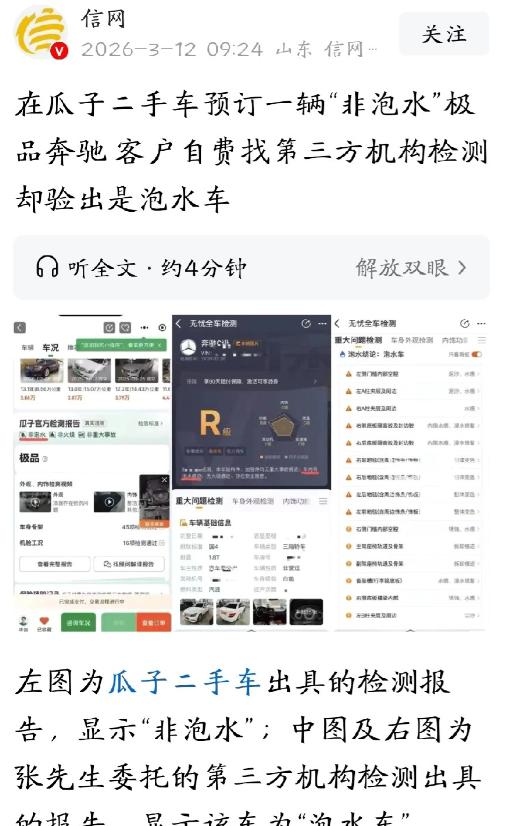 妥妥的诈骗!山东德州,男子在某二手车平台看了一辆13款的奔驰C260,标价4.35万,官方检测报告上写着“非泡水、非火烧、非重大事故”,他觉得性价比挺高,马上付了1000元定金。为了保险,他又花599元找了第三方机构进行检测,谁知,发现这车竟然是辆泡水车。事后,平台承认,复检结果确实是泡水车,但鉴定日期却是自己发现之前。男子怒了,他怀疑平台明知车子有问题,还要卖给他,纯属诈骗,要求赔偿。 买二手车这事,说白了就跟开盲盒似的,运气好能捡个大漏,运气不好那就是往火坑里跳,大家都觉得找个有名气的大平台,有专业检测、有信誉背书,肯定比路边摊靠谱吧? 山东德州的张先生也是这么想的,结果在2026年2月下旬,现实狠狠给了他一巴掌,差点让他栽了个大跟头。 这事还得从张先生想买辆代步车说起,他在一家挺知名的二手车平台上逛游,一眼就相中了一辆2013款的奔驰C260。 虽说车龄是稍微长了点,但架不住它是奔驰啊,而且标价才4.35万元,这性价比简直没谁了。 最关键的是,平台给出的官方检测报告那是写得信誓旦旦:白纸黑字标注着“非泡水、非火烧、非重大事故”。 销售人员也是拍着胸脯保证,车况绝对透明,支持任何形式的第三方复检,张先生一听,心里这块石头算落地了,当即就交了1000块钱定金把车锁下。 但这老张是个细心人,平时没少听那些二手车行的猫腻,心里琢磨着:平台的话不能全信,还是得找个不沾亲带故的“包青天”来看看。 于是,他又自掏腰包花了599元,请了一家独立的第三方检测机构,约好时间去现场验车。 到了验车那天,平台的工作人员把车开过来了,那是相当配合,张先生本来还挺乐观,觉得这也就是走个过场,买个心安。谁承想,人家专业的技师上手没一会,脸色就不对劲了。 技师指着座椅底下、线束的缝隙,还有底盘隔音胶这些隐蔽的角落给张先生看,好家伙,里面全是还没清理干净的泥沙,还有明显的锈蚀痕迹。 懂行的一看便知,这哪是什么精品车,分明就是个典型的“泡水车”,没过多久,第三方的正式报告出来了,结论下得死死的:此车为泡水车。 张先生当时就懵了,拿着平台那份“三无”好车的报告,再看看眼前这份刚出炉的“泡水判决书”,这反差也太大了!平台的工作人员一看露馅了,也没多说什么,灰溜溜地把车开回去说是要复检。 几天后,平台的回复来了,倒是承认了这就是辆泡水车,说车辆没通过他们的认证,可这事还没完,张先生拿到平台所谓的复检报告一看,肺都要气炸了。 那报告上的日期,竟然写的是在他找第三方检测之前的日子!这逻辑怎么盘都盘不通啊:既然你们在那之前就已经检测出是泡水车了,为啥还挂在网上当好车卖?为啥还敢收定金?这不是明摆着揣着明白装糊涂,把消费者当猴耍吗?这哪是失误,这分明就是欺诈。 随后,平台把订单关了,把那1000块钱定金退了回来,但对于张先生白白损失的检测费和这几天的折腾,平台一开始居然只想给一张200块钱的购车优惠券打发了事,还限期30天使用。 张先生当然不干,合着我帮你们排了雷,花了钱受了气,最后还得在你们这消费才能用这补偿?经过好几轮的扯皮和沟通,平台最后才松口,赔了张先生检测费和交通费一共1000块钱。 至于为啥一开始没检出来,以及那个诡异的报告日期,平台那边含糊其辞,一会儿说是系统出漏洞了,一会儿说是人员手滑选错日子,反正就是没个准话。 张先生这回算是吓出了一身冷汗,幸亏自己多留了个心眼,坚持做了第三方检测,要是真信了平台的邪,把这辆泡水奔驰买回去,那后患无穷。 这种车电路板受潮容易短路,机械部件锈蚀严重,开在路上那就是个移动的定时炸弹,搞不好哪天就自燃或者失灵了,而且修都没法修,卖更卖不掉。 这事在网上一传开,不少想买二手车的朋友都觉得后背发凉,大家原本图的是大平台的省心和保障,没成想那里面的水一点都不比外面浅。 所谓的专业检测,有时候就是走个过场;明知道车有问题还往外推,出了事就推诿扯皮,律师也说了,平台既然敢卖,就得对车况负责,把泡水车当好车卖,这就构成了违约甚至欺诈,消费者完全有理由索赔。 这件事给咱们提了个醒:在二手车这个行当里,不管平台名头多响亮,报告做得多漂亮,那都只能当个参考。 真到了掏钱的时候,还是得信自己找的独立第三方。这4万多块钱的教训也告诉那些平台,公信力这东西积攒起来难,毁掉它只需要一次敷衍和欺骗。 希望这个行业能早点把那些乌烟瘴气的套路收一收,别让老实人买辆车还得跟防贼似的。 对此你怎么看? 信源:海报新闻