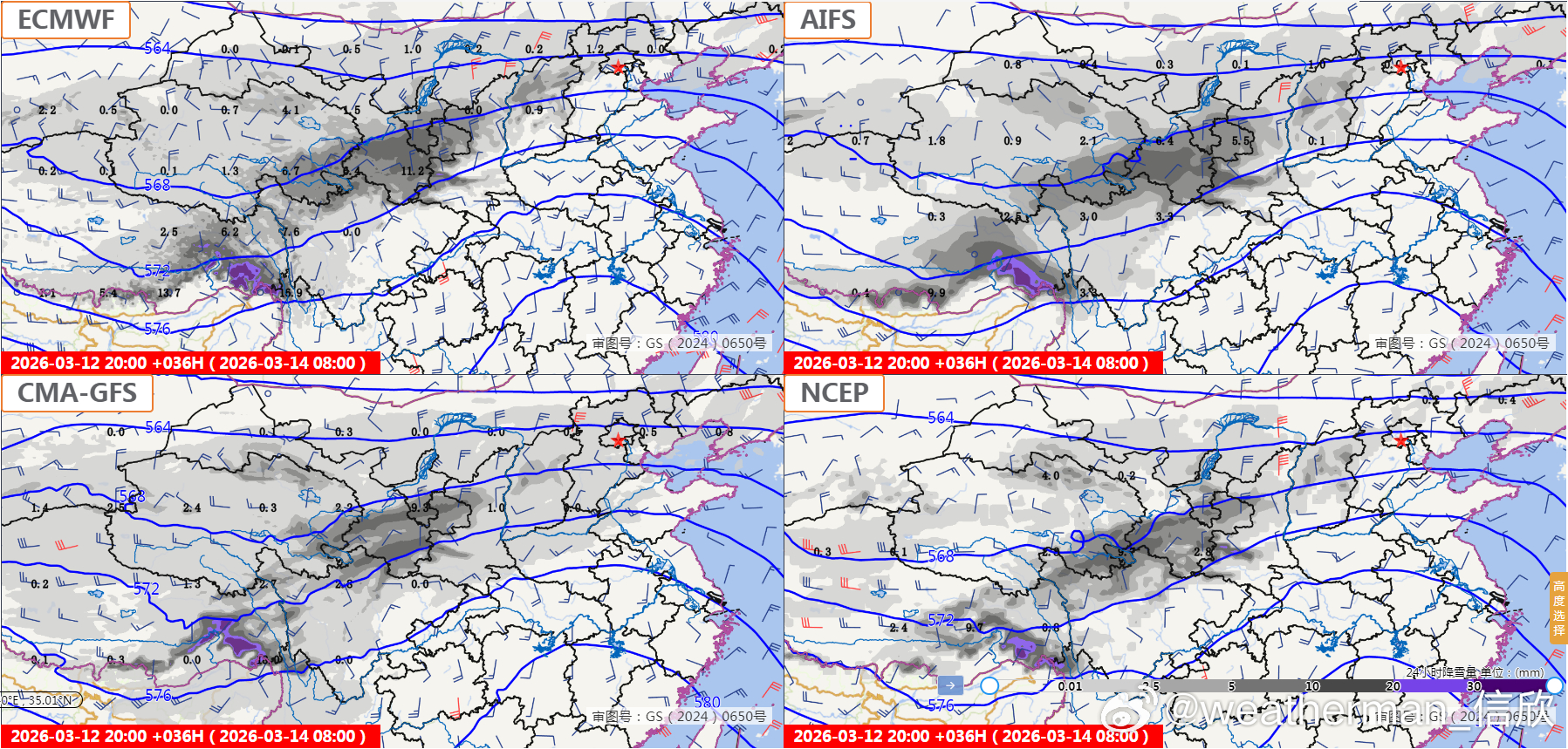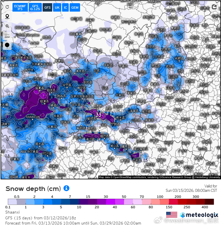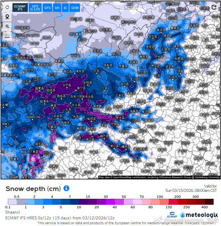 四川甘肃宁夏陕西山西等地,因为气温处于雨雪临界,而且地形也比较复杂,在山地海拔较高的地方,气温低,利于降雪。而一些河谷、小盆地的低海拔地区,气温会相对高一些,可能降水偏向降雨。因此上述地区,有些地方的降雪可能超预期,也有可能有些地方降雪不及预期。图6-7为模式预报的降雪量对比,图8-9为15日晨积雪预报的对比。
