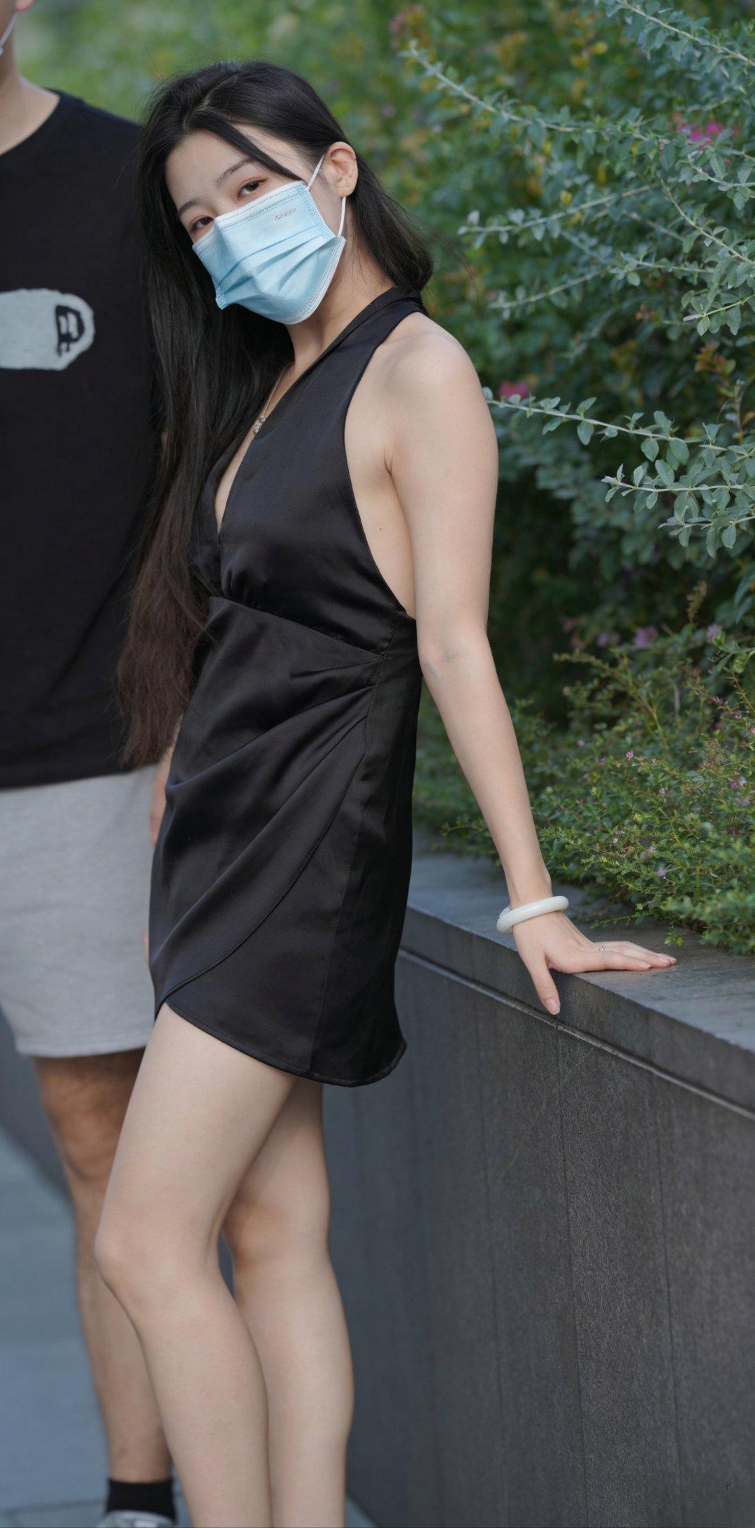 夏日街头的氛围感,被这位姐姐狠狠拿捏。 一袭黑色缎面挂脖短裙,丝滑的面料带高级光泽感,挂脖设计露出精致锁骨与肩线,深V剪裁又添了几分小性感,不规则裙摆刚好衬得双腿又细又直,走路时摇曳生姿。 搭配透明粗跟凉鞋,走路也稳当舒适。腕间一只温润的玉镯,中和了黑裙的冷艳,多了几分东方温婉感,细节处尽显品味。 摘掉口罩的瞬间,明媚的笑容让整个人都甜美起来,黑长直的发丝垂在肩头,温柔又灵活。这样的穿搭,既有成熟女性的优雅韵味,又不失少女的娇羞感,难怪一出场就成了街头焦点。