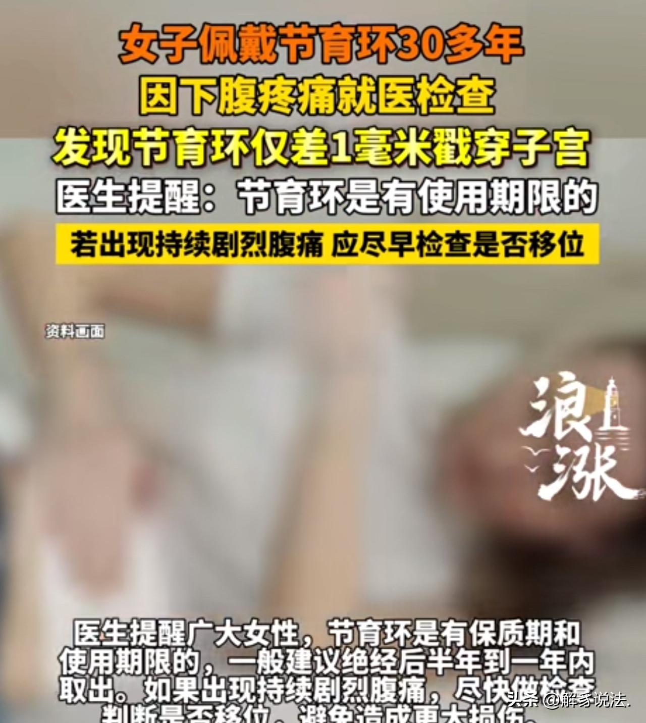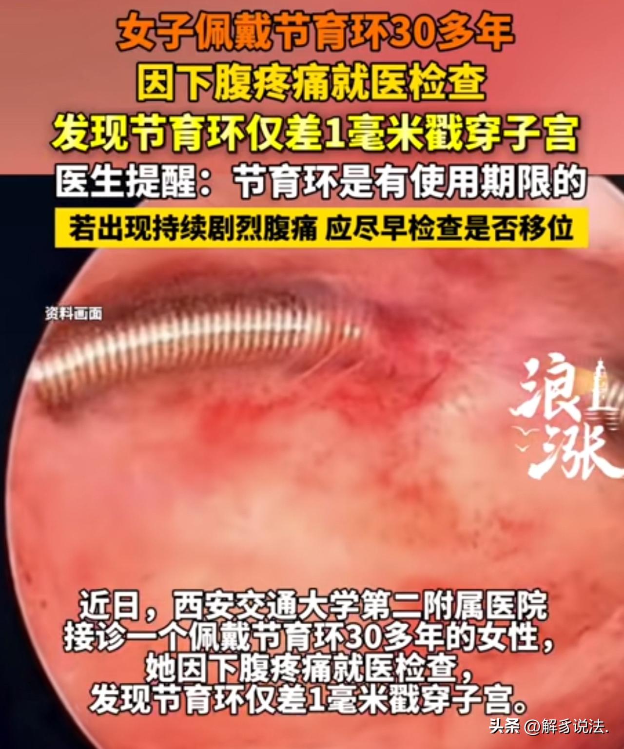 陕西西安,女子突然小腹疼痛,到医院一查,发现,她戴了30多年的节育环导致的,医生说,怎么才来,仅差一毫米,就要戳穿子宫,一旦戳穿,就会导致肠坏死,危及生命。大妈后怕不已! 近日,张阿姨可被吓坏了,下腹疼得直不起腰,一查才知道,肚子里那枚戴了三十多年的节育环,居然快把子宫戳穿了,就差1毫米,再晚一步就要出大事。 张阿姨年轻的时候就上了节育环,这一戴就是三十多年,她总觉得这东西放进去就不用管了,加上后来绝经了,也没再想起要去医院取出来。 直到最近,她总觉得下腹隐隐作痛,一开始还以为是普通的肚子疼,忍忍就过去了,可后来疼得越来越厉害,连走路都费劲,家人才赶紧把她送到了西安交大第二附属医院。 医生一检查,都倒吸了一口凉气:那枚金属节育环已经深深嵌进了子宫壁里,距离完全戳穿子宫就差1毫米,再晚来几天,就要穿透子宫扎进旁边的肠道里了。 医生说,要是真扎穿了,很可能引发肠穿孔、肠坏死,那可是会危及生命的。 看着检查报告,张阿姨后怕得直冒冷汗,她怎么也没想到,这枚帮她避孕的节育环,居然成了埋在身体里的“定时炸弹”。 医生告诉她,节育环可不是“一劳永逸”的,每种节育环都有自己的使用期限,而且女性绝经后,子宫会慢慢萎缩,节育环就容易移位、嵌顿,甚至穿孔,一般建议绝经后半年到一年就得取出来。 这次经历给张阿姨和家人都提了个醒,也给所有戴过节育环的女性敲了警钟:别觉得身体没不舒服就不管它,要是出现持续的剧烈腹痛,一定要赶紧去医院检查,看看是不是节育环移位了。 钱没了可以再赚,可身体要是出了大问题,那可就追悔莫及了。 现在张阿姨已经顺利取出了节育环,身体也在慢慢恢复,她逢人就念叨:这东西可不能一直放着,该取就得取,千万别像我一样,差点把自己搭进去。 《民法典》第1004条规定:自然人享有健康权,身心健康受法律保护,任何组织或者个人不得侵害他人的健康权。 张阿姨的健康因节育环长期滞留遭受严重威胁,若因机构未履行告知、随访义务导致损害,可依法主张赔偿;公民自身也应重视健康管理,主动维护生命健康权,避免因疏忽引发不可逆伤害。 此事曝光后,网友在评论区分享了自己的经历。 我带了十一年了不敢取啊!就因为准备去取的那一次坐在外面等号里面连续两位都叫的那叫一个惨,然后我就跑了,护士打我电话我说不做了,拖到现在也不敢去! 不带不给孩子上户口,没办法就带了,结果差点因为这死掉,带上三年以后,突然一直流血,怎么看也不好,拖拖拉拉将近一年,医生也没说是环的事。不知道什么原因,这里查那里查,中医西医都看,天天中药西药的吃,就是不好,最后实在没办法了就想着把环去掉试试能不能好,医院要社区计划生育那里开证明才能给去掉,社区说什么也不给开,眼巴巴的可怜的我,流血流的眼睛时不时的看不见,耳朵偶尔听不清,骑自行车送孩子去幼儿园也蹬不动车子了,最后找了个熟人亲戚,领着我去医院摘了,摘了第二天就不流血了,捡回来一条命。想想那时候是怎么过来的啊,以为得了什么不治之症,精神上财力上,双重打击,不能上班,还天天吃药看病,又没钱!