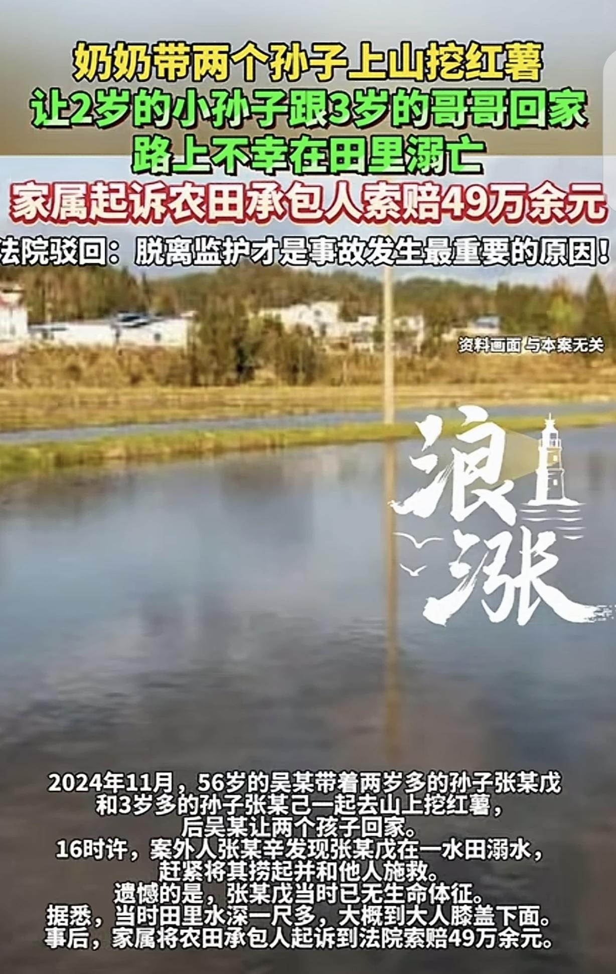 “悲剧还是发生了!”56岁女子,带着3岁和2岁的孙子上山挖红薯,然后让2岁的孙子跟着3岁哥哥回家,路上不幸在水深一尺多的田里溺亡,家属跟农田承包人索赔49万,法院驳回,认为脱离监护才是悲剧发生的原因,不料,家属不服,提起上诉,要求判决农田承包人承担10%的责任,赔偿9.9万。二审法院判决出乎意料。 当天下午,吴某带着两个孩子来到村后的山坡上,这片山坡上种着不少红薯,是村民们常来劳作的地方。 吴某找好位置就开始挖红薯,两个孩子在一旁玩耍,一会儿追追蝴蝶,一会儿蹲在地上玩泥土,吴某偶尔抬头看一眼,觉得孩子就在身边,不会出什么事。 挖了大概一个多小时,红薯挖了小半筐,吴某觉得有些累,也想着早点回家,就做出了一个让人揪心的决定——让两个年幼的孩子自己先回家。 周围的村民后来回忆,当时有人劝过吴某,说两个孩子太小,独自回家太危险,山上的小路崎岖,还有不少农田水坑,可吴某却觉得,回家的路也就十几分钟,两个孩子一起走,互相有个照应,应该不会出问题。 她万万没有想到,就是这个看似简单的决定,酿成了无法挽回的悲剧。两三岁的孩子,对危险没有任何认知,走路都还需要搀扶,更别说独自应对路上的各种状况,哪怕是一个小小的水坑,都可能成为致命的陷阱。 下午四点多,村民张某新干完农活,沿着田埂往家走,路过一处水田时,突然发现水田边缘有一个小小的身影浮在水面上,他心里一紧,赶紧跑过去,仔细一看,竟是吴某两岁的小孙子张某茂。 张某新来不及多想,立刻跳进水里,小心翼翼地将孩子捞起,一边大声呼喊周围的村民,一边对孩子进行急救,按压胸口、做人工呼吸,赶来的村民也一起帮忙,可不管大家怎么努力,孩子的身体还是越来越凉,最终没有了生命体征。 事发时,那片水田里的水深只有一尺多,大概到成年人的膝盖下面,对于成年人来说,这样的水深根本不算危险,可对于身高不足一米的两岁幼童来说,这片看似平静的浅水,就是一个无法挣脱的“深渊”。 据了解,这片水田是当地村民承包的,主要用来种植水稻,事发时刚收割完水稻,田里还残留着灌溉用水,没有及时排干,也没有设置任何警示标志。 孩子的突然离世,让吴某和家属陷入了巨大的悲痛中,好好的一个孩子,出门时还蹦蹦跳跳,回来时却没了气息,换做任何一个家庭,都无法接受这样的打击。 在悲痛之余,家属认为,农田承包人没有尽到安全管理义务,田里有水却不设置警示标志,也没有采取防护措施,才导致孩子溺水身亡,于是将农田承包人起诉到当地法院,提出了49万多元的赔偿诉求。 一审法院受理案件后,对事发经过、现场情况以及相关责任进行了详细调查核实。法院认为,涉案水田属于农业生产用地,并非对不特定公众开放的公共场所。 承包人承包农田是用于农业生产,按照农村农田的普遍使用习惯,无需在周围设置警示标识或防护设施,其对农田的管理符合相关规定,不存在过错。 而吴某作为两个孩子的临时监护人,放任未满三周岁的幼童脱离监护,独自回家,这才是导致悲剧发生的直接、根本原因,因此驳回了家属的全部诉讼请求。 家属对一审判决不服,认为农田承包人即便没有法定的安全保障义务,也存在一定的管理疏忽,于是提起上诉,调整了索赔诉求,不再要求全额赔偿,而是要求农田承包人承担10%的责任,赔偿9.9万元。 家属坚持认为,若承包人能及时排干田里的水,或者设置简单的警示标志,或许就能避免悲剧发生,承包人理应承担相应的责任。 二审法院依法公开审理了此案,结合一审证据、事发现场勘查报告以及相关法律规定,作出了出乎意料的判决——维持一审原判,再次驳回家属的上诉请求。 二审法院明确指出,涉案农田是合法承包的农业生产用地,承包人的使用行为符合《湖南省小型农业水利设施管护办法》等相关规定,其对农田的管理不存在过错,也未创设新的危险。 而监护人的监护失职,是事故发生的唯一根本原因,与农田承包人无关,因此承包人无需承担任何赔偿责任。 这起案件给所有家长都敲响了警钟,孩子的安全容不得半点马虎。作为监护人,一定要时刻尽到自己的责任,不能因为一时的疏忽,而留下无法挽回的遗憾。 信源:浪涨新闻