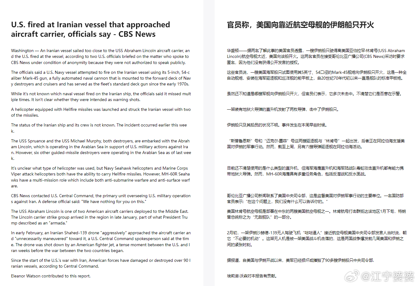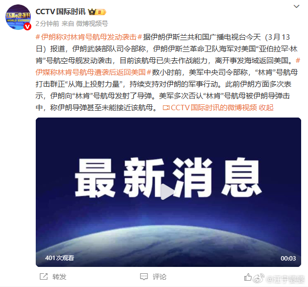 伊朗称对林肯号航母发动袭击 ←伊朗这一次袭击破天荒的获得了美国严肃媒体的证实,而且看起来,几乎突防成功。鉴于美国人那堪比方便面包装的诚信,我个人现在对伊朗的说法持谨慎观望态度。