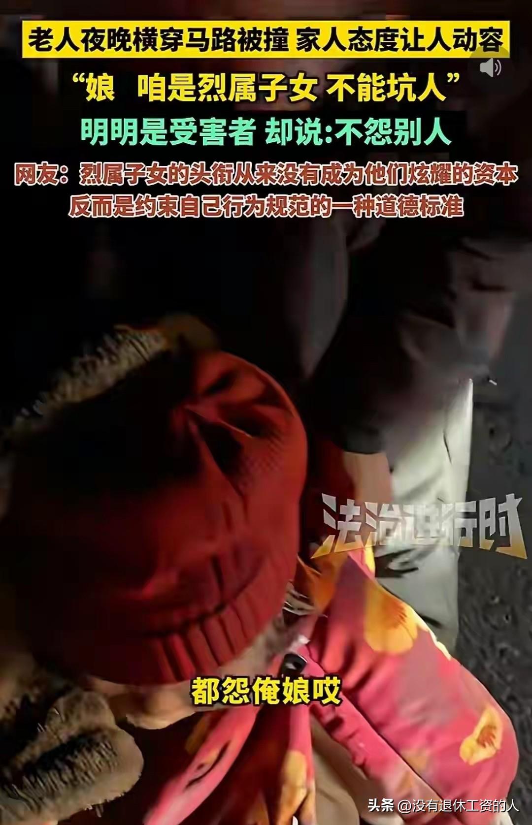 没有想到,一句“咱们是烈属子女,不能坑人”,让全国的网友们破防了。 一位老奶奶在横穿马路时,由于天黑视线不好,被一辆车给撞倒了。 司机马上拨打了120,同时联系上了老人的儿子。 在等待的这段时间里,司机内心忐忑不安,这下可闯了大祸,待会家属来了,还不知道该怎么狮子大开口。 不多久,老人的儿子来到了现场。他没有笫一时间和肇事司机争吵,先了解清楚事情的原委。 当他得知,是老人横穿马路被车撞了,他没有责怪司机和要求赔偿,反而向司机道歉。 “是我没有照看好老人,横穿马路给你添麻烦了”。他一面安慰自己的母亲,一面给司机道歉。 司机表示:我也有责任,我已经打了120,该我负的责任,我也会负。 然而这个儿子的一句话:让在场的人动容。他说:不怨人家,咱们是烈属子女,不能坑人,一会你坐我的车,别耽误人家孩子。 烈属子女的头衔,从来都不是他们炫耀的资本,而是约束自己行为规范的道德标准。 这是一种责任,一种刻在骨子里的担当。 司机没有逃避责任,烈属子女更加把责任放在时时刻刻,这样的情景,能不让人感动吗? 难怪有网友说:听到他们那些对话以后,感觉精神都得到了升华! 闯红灯老奶奶 闯红灯老人