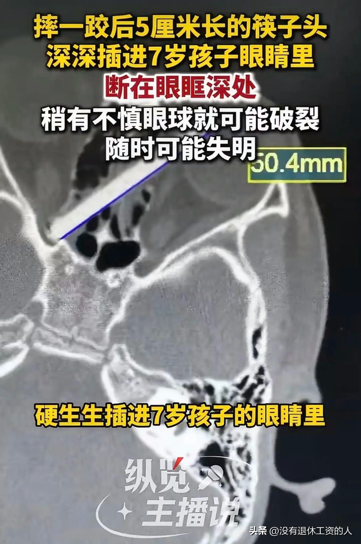 太可怕了,这个孩子到现在都害怕拿筷子。 浙江一个7岁的小男孩,吃饭前摔了一跤,手里的筷子断成了两截。 父母在地上找了一圈,没有看到什么,而孩子一直捂着左眼睛说疼。 送到医院以后检查,医生都被惊到了。只见孩子的眼皮上有个黑点,没有流血没有看到筷子头。 而CT结果一出来,那个黑点里面,就是断了的筷子头。从眼皮上穿进去,横跨了整个鼻梁后面。 而这根筷子左边贴着左眼球壁,右边抵着视神经,里面是密密麻麻的血管,靠近大脑。 可以说是不幸中的万幸了,筷子完美的避开了所有重要的器官。 经过医院各科室的共同努力,这根插到眼睛里的“大刺”,被取了出来,孩子的眼睛保住了,视力恢复到正常。 很难想象,这样的手术风险有多大,还好成功了。 这件事情也提醒家长,孩子在用筷子,撸串吃烧烤的时候,一定要注意安全。 小孩被筷子刺伤 孩子被筷子刺伤 外国人拿筷子 娃误碰危险物品 小学生骨折 萌娃筷子功 儿童夹筷子