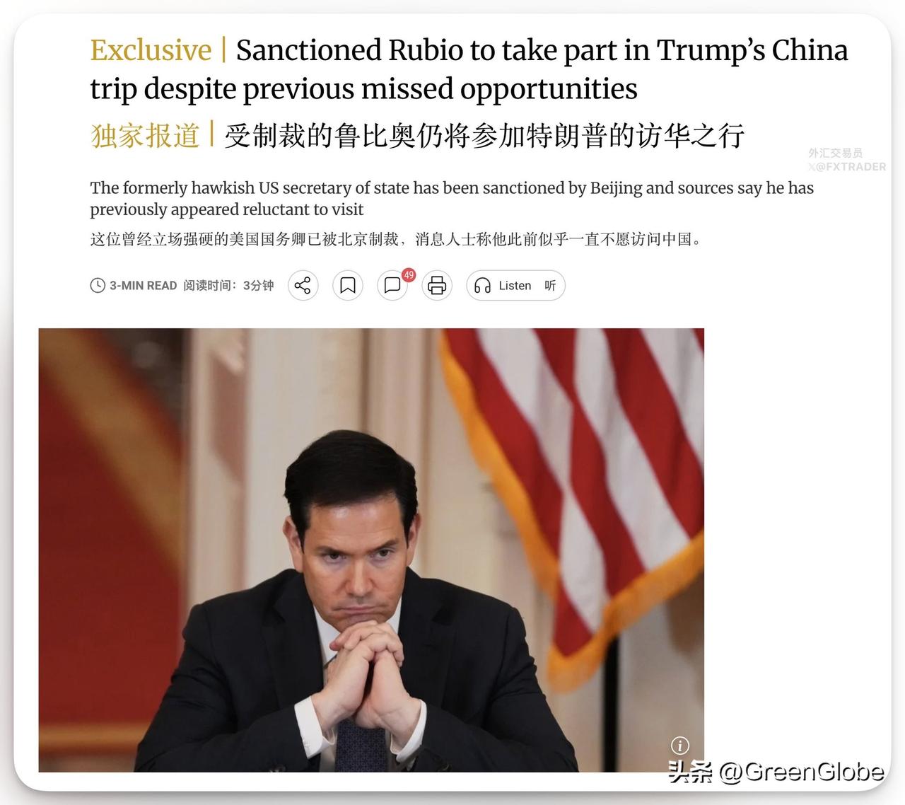 香港《南华早报》报道:被中国制裁的现任美国国务卿鲁比奥近期接受邀请,将参加特朗普的访华之行。 中国尚未明确是否会豁免制裁,而上个月鲁比奥回应相关问题时表示“等我去了就知道了。” 消息人士称,鲁比奥此前不愿前往中国是因为不愿被视为软化对华强硬的立场。但鉴于此次峰会对全球的重要性,他不会想缺席。 以上报道均未得到外交部证实。