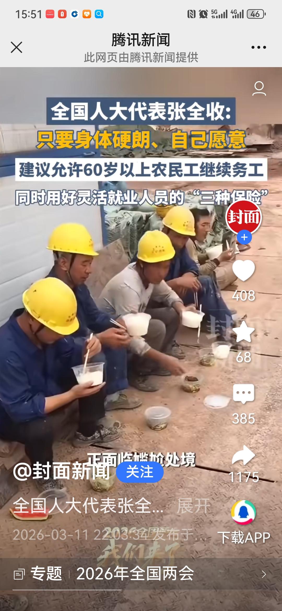来自河南的人大代表张全收关于允许60岁以上的农民工就业的提议符合实际,符合民意,有操作空间,这个提议提的好,提到广大农民的心里了。 有的人可能不了解情况,说没有不让60岁以上的农民工就业呀。 实际上,在我们的建筑, 水利批,公路等工程建设的工地,按照劳动法规定,是不允许有60岁以上的老人进场务工的,当地的劳动监察部门会严格查处的。当然,查处的理由不是年龄问题,而是只要超过60岁,就不能参加工伤保险,这是强制规定。所以,许许多多身体健康,有工作意愿和能力的60岁以上的老人被拒之门外。 而现实中,确确实实有许许多多的60岁以上的农村老人有外出务工的需求 。一是他们的身体硬朗,有工作经验,技术 ,是工地的急需人才;二是他们因为退休之后只有100多的养老金很难保障他们的生活支出,外出务工可以弥补这一方面的短板,并且可以为今后随着年龄增长,出现大病等问题提前准备一点积蓄。 张全收是一个基层的支部书记,又是一个企业家 ,他最了解农民的期盼和需要,所以他提问题提到了关键的点子上了。 这个问题,应该是有解决空间的,就是允许这些身体条件较好的农民朋友参加工伤保险即可,即便法律目前还不允许,按照延迟退休的规定先放宽到63岁,应该是可以的。务工者权益保障 濮阳农民工