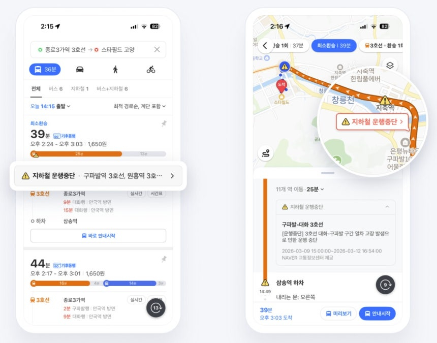 与此同时,NAVER地图还更新了功能,可以在路线搜索过程中方便地确认实时公共交通运行受阻信息。