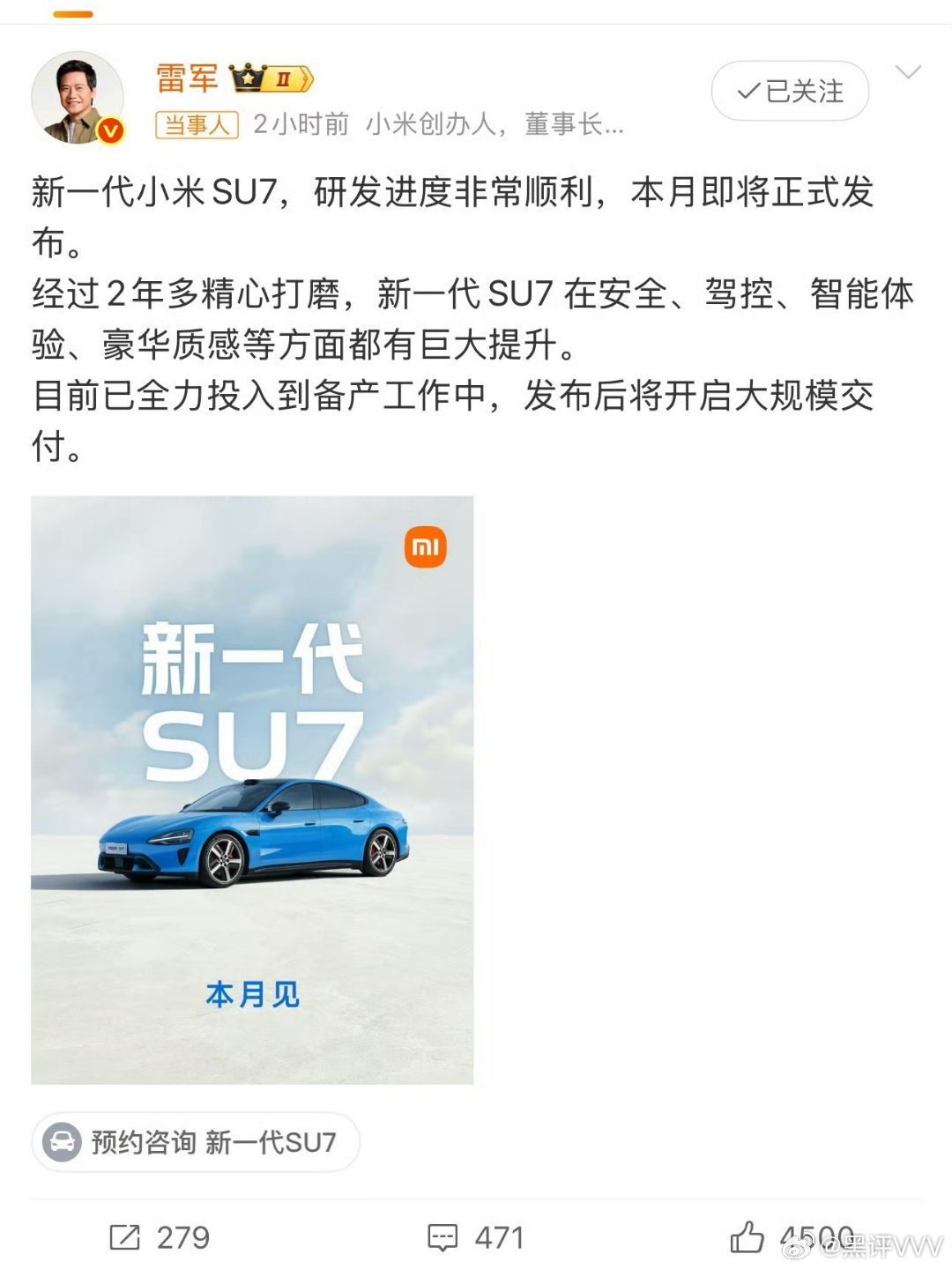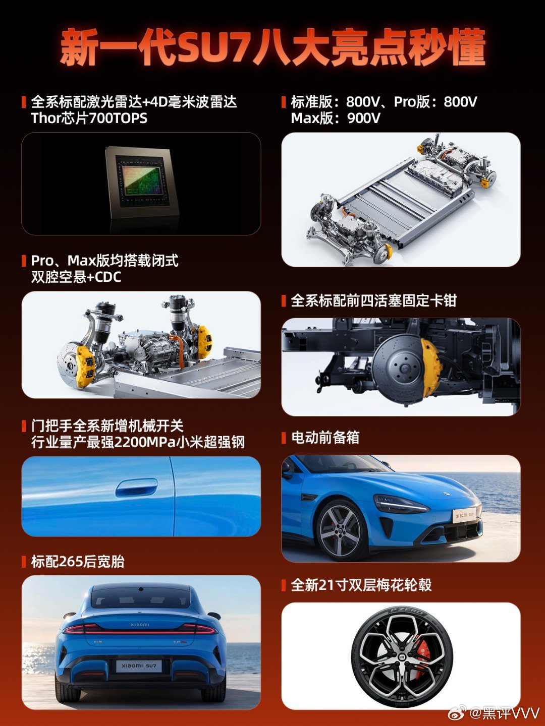 新一代小米SU7升级巨大,不仅有9气囊、2200Mpa热成型钢车门防撞梁、内嵌式防滚架,还有800V架构,V6s Plus电机,前窄后宽轮胎、四活塞固定卡钳、激光雷达、4D毫米波雷达等等,据说试驾过的媒体普遍都给到9分以上,对比特斯拉Model3可以说是全面碾压胜出,如果涨价幅度只是1-1.4万之间,那绝对真香。另外,听说新一代小米SU7目前备产达到了1.6万辆,上市即交付,如此大规模的备货,让更多人第一时间买得到,诚意满满,信心满满,本月发布,我非常期待了。雷军表示新一代SU7确定涨价小米新一代SU7已提前大规模备产