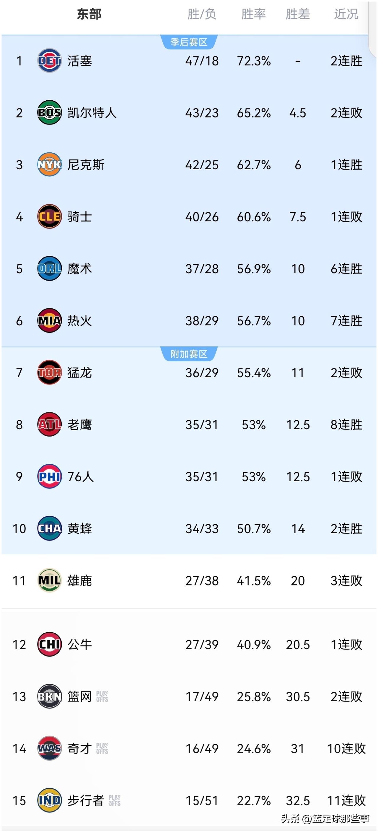 NBA东部最新积分榜: ✅活塞131:109大胜残阵76人继续领跑,活塞12人全部出场11人均有得分,无一人上场超过30分钟,实力确实超群; ✅凯尔特人102:104遭雷霆绝杀第2还是稳的,塔图姆缺阵布朗独木难支,亚历山大连续127场得分上20+,打破张伯伦记录独享历史第一人; ✅热火112:105击败雄鹿豪取7连胜升至第6位,阿德巴约20投仅6中得到21分8板,不过阿德巴约上场砍下83分引发外界质疑; ✅老鹰108:97轻取篮网豪取8连胜升至第8,约翰逊21分9板9助渐入佳境,交易后的新老鹰展翅翱翔; ✅魔术136:131击败奇才豪取6连胜排在第5,魔术先发五虎得分全部上双还有三人上20+; ✅其他场次比赛结果,步行者108:123太阳惨遭11连败继续摆烂。