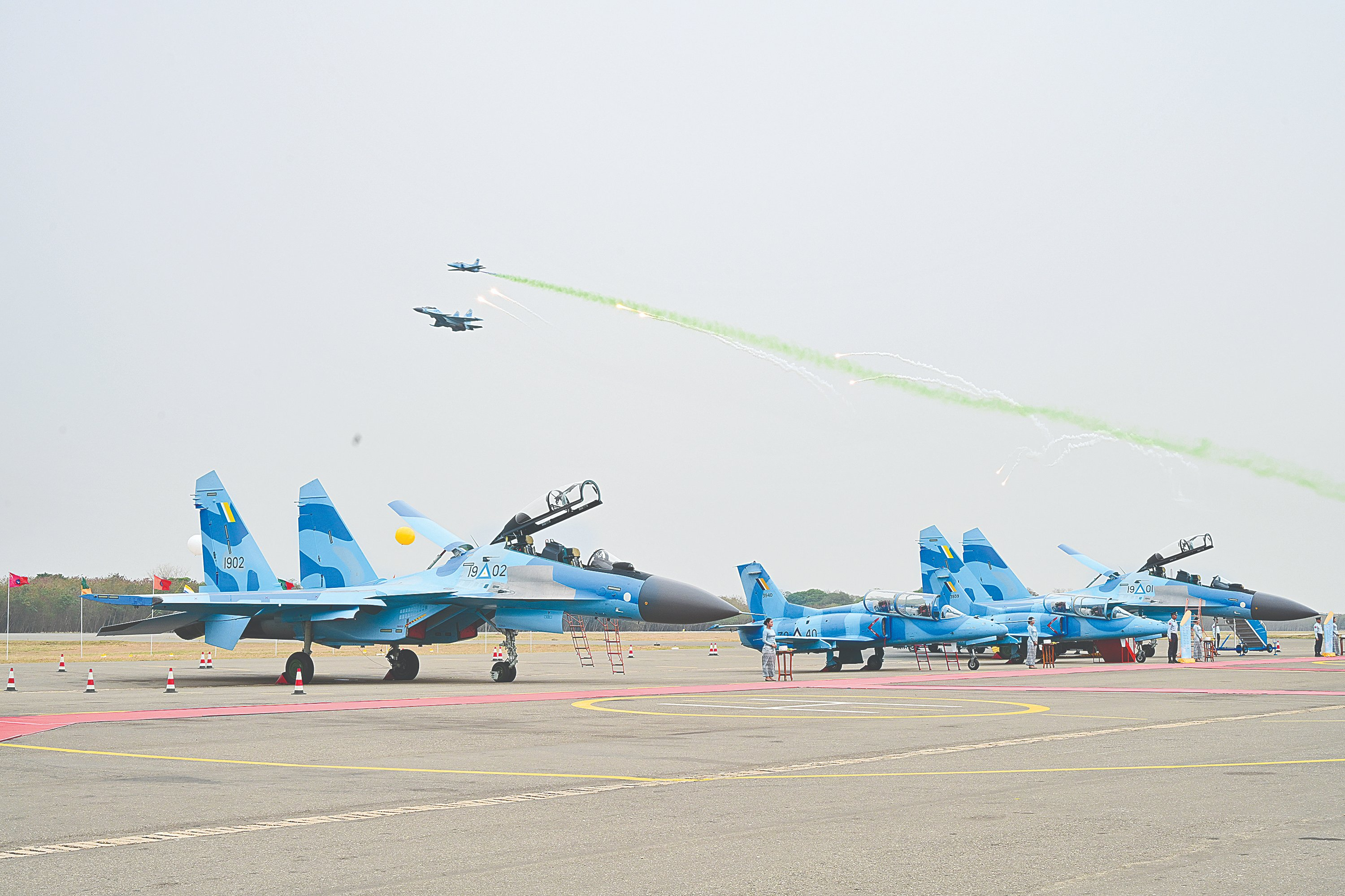 敏大帅增购的2架苏-30SME交付。缅甸通讯社发布照片,证实3月13日,缅甸空军在曼德勒密铁拉空军基地举行了2架新交付的苏-30SME战斗机和2架K-8教练机的服役仪式。之前缅甸订购的6架苏-30SME已经在分别于2022年12月、2023年12月,及2024年12月分批交付,这两架是2023年签订的增购订单。
