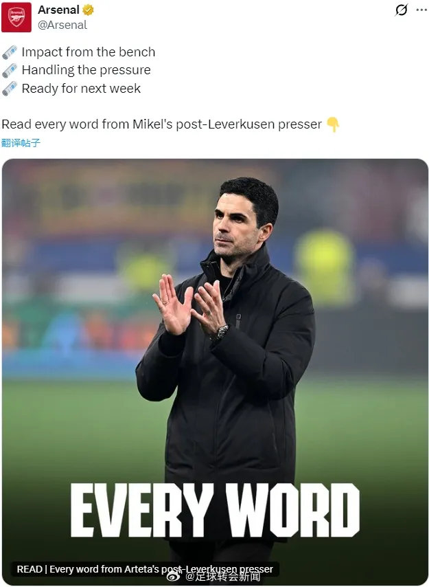 阿尔特塔出席了赛后新闻发布会,我们来看看阿森纳主帅的发言。