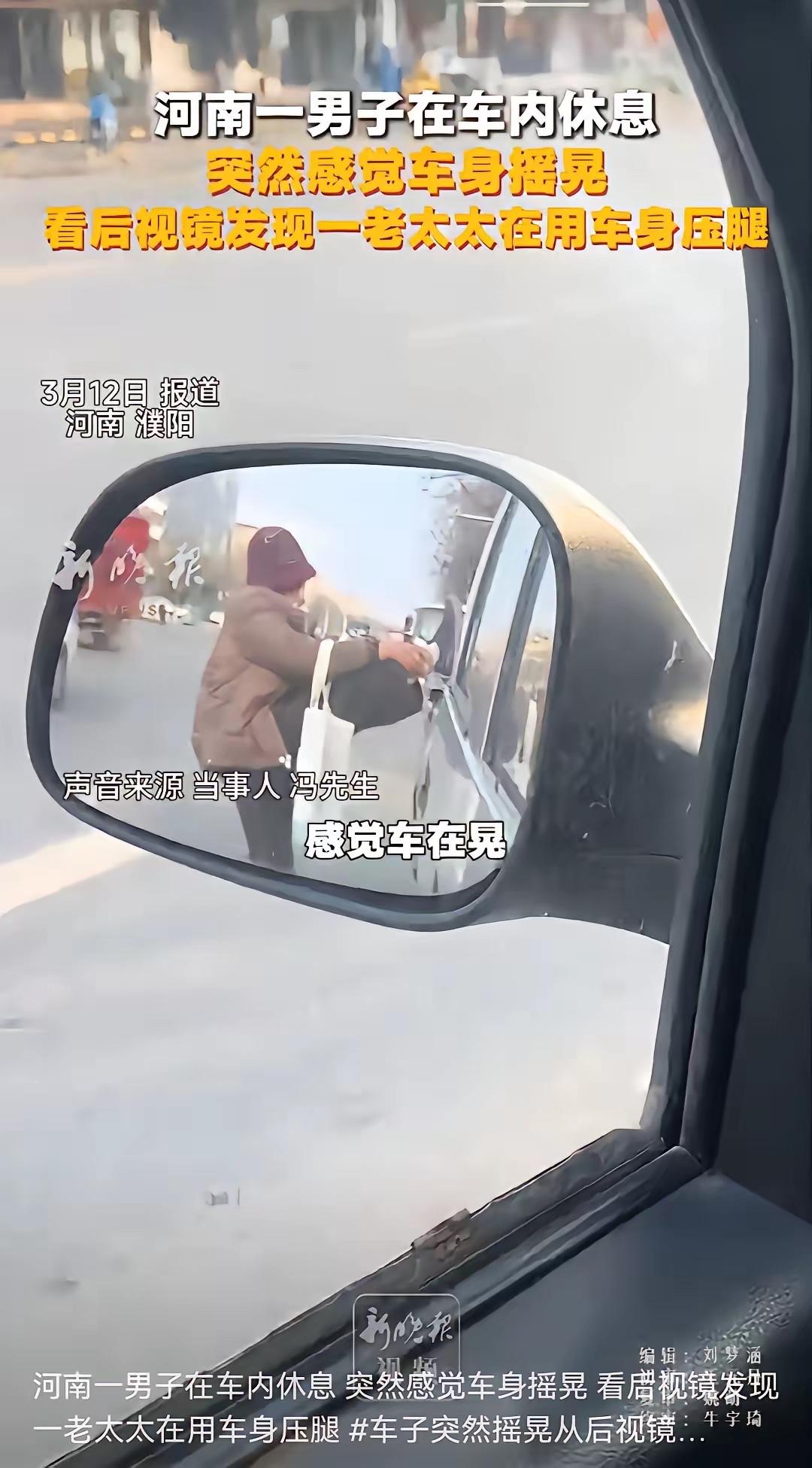 河南一男子在车内休息,突然感觉车身摇晃,看后视镜发现一老太太在用车身压腿。3月12日,河南濮阳这事儿被当事人冯先生发到网上,一下子让好多人心里软乎乎的。 有网友表示:有的老年人不管不顾的做事情,还是可能和自身大脑的管控关联。还是应自尊自爱、不倚老卖老,做事不违背人格、老有所为才能赢的他人尊敬的。 老人动作慢悠悠的,把车身当成了顺手的健身工具,神情自在又放松,丝毫没有拘谨的样子,画面看着格外温馨。这件小事没有争吵,没有麻烦,反倒像生活里一颗甜甜的糖,让看到的人都觉得心里暖暖的。 老人虽做法欠妥,但并无恶意,只是想简单活动筋骨。车主的包容与体谅,化解了潜在矛盾,尽显市井温情。小事见格局,多一份理解,生活就多一份温暖。 冯先生这事儿办得真敞亮!他没揪着“你碰我车了”不放,而是看懂了老人就是想活动活动,用一句软话把事儿化解了。其实生活里好多别扭,都是因为少了点体谅。咱不是说可以随便用别人东西,底线得守,但在不碍事的情况下,多给陌生人一点包容,多份理解,这才是咱们普通人最实在的温暖啊。 对此大家怎么看呢