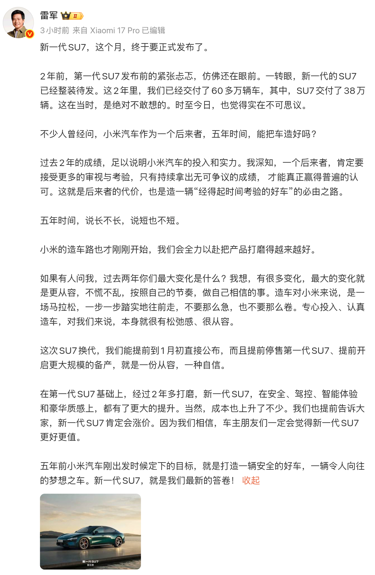 还记得两年前小米发布第一代SU7时,网上都说能月销3000辆就烧高香了,结果现在已经交付了38万辆,一举撬开了中国纯电轿跑车的市场,坐看新一代SU7能不能再创新高了雷军称新SU7是造车5年最新答卷