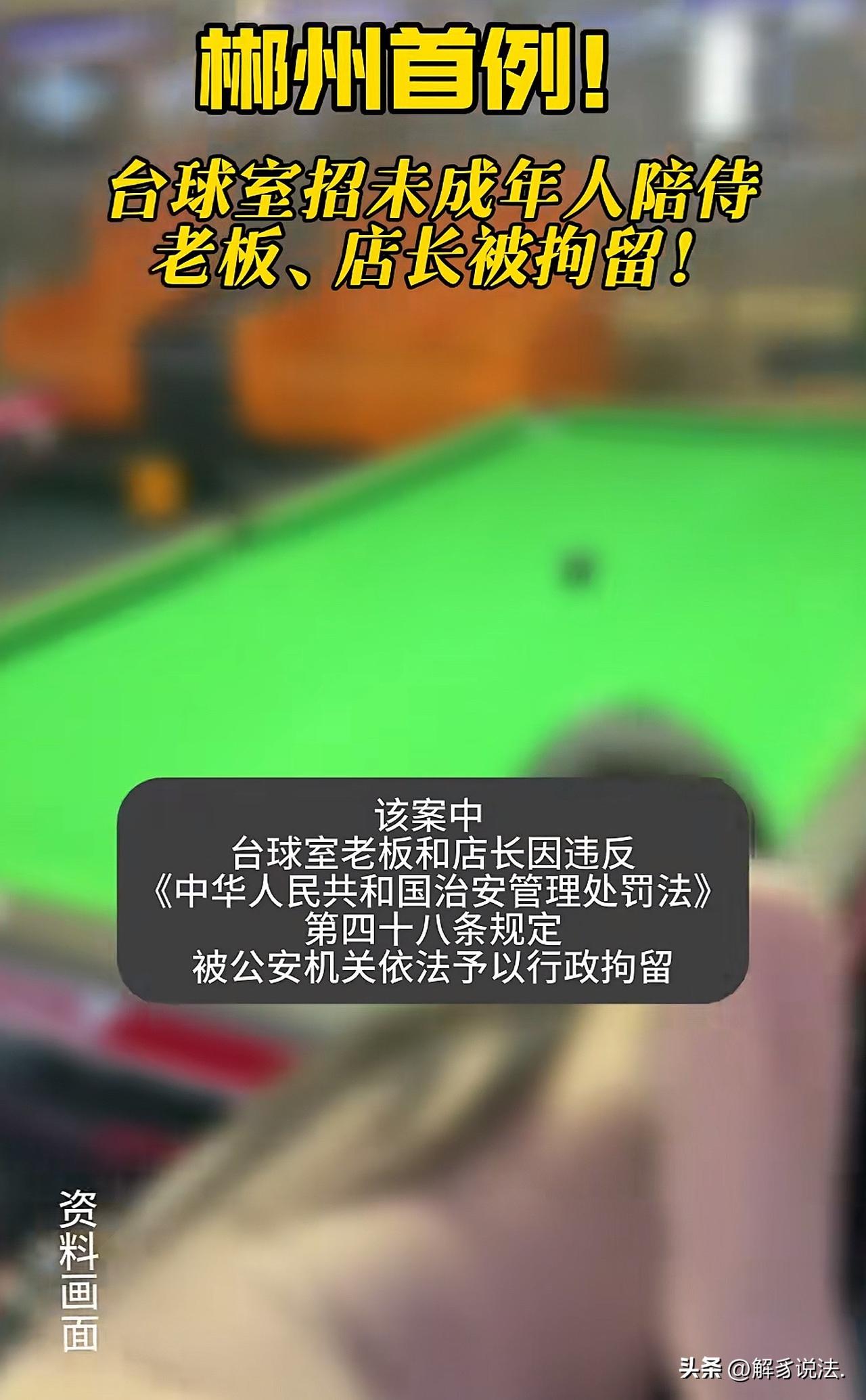“必须严惩不贷”湖南省郴州,一台球厅的老板和店长,为了牟利,多次招聘未成年为助教,为客人提供有偿赔偿,长达10个月的非法经营。天网恢恢疏而不漏,最终,被警方抓获。警方认定二人违反《治安管理处罚法》中关于未成年人保护新增条文,目前,二人均已被行政拘留。此案为郴州首例。 2026年3月11日的一个深夜,北湖区国庆南路某台球室的灯突然熄灭,紧接着,几辆警车呼啸而至。 民警破门而入,将正在包厢里给客人提供陪侍服务的未成年人当场控制,股东付某、店长刘某也被一并带走。 这场持续近10个月的非法经营案,终于画上了句号。 2025年3月,付某和刘某接手这家台球室后,生意一直不温不火。 为了快速牟利,两人动起了歪心思,招聘未成年人当助教,给客人提供有偿陪侍。 他们心里清楚,明令禁止娱乐场所招用未成年人,更不允许提供营利性陪侍服务,可在来钱快的诱惑下,早就把法律抛到了脑后。 为了不被发现,他们玩起了暗箱操作。 招聘时,他们专门找那些年龄偏小、看起来涉世未深的年轻人,大多是刚辍学出来打工的孩子。 付某和刘某明知对方是未成年人,却故意装作没看出来,还编造轻松上班、高薪提成的谎言哄骗入职。 日常经营中,他们实行两套模式。 白天,台球室正常营业,只摆几张台球桌,看起来规规矩矩;一到晚上,就开始运作。 包厢被窗帘遮得严严实实,门口安排专人望风,一旦有陌生人靠近,就立刻发出警报。 所谓的助教,其实就是陪客人打球、喝酒、聊天,每服务一次就能拿到高额提成,而这些钱,大部分都被付某和刘某抽走。 他们还利用信息差规避监管。 招聘时不签正式合同,不给未成年人缴纳社保,甚至没收他们的手机,防止他们私下联系或泄露情况。 为了应对检查,他们还教助教们统一口径,要是有人问起年龄,就说自己已经成年;要是遇到客人质疑,就赶紧换话题,绝口不提陪侍的核心目的。 可付某和刘某在利益的驱使下,变本加厉,先后招聘多名未成年人,持续通过这种方式牟利,以为能躲过法律的制裁。 殊不知,天网恢恢,疏而不漏。 民警在日常巡查中发现了这家台球室的异常,经过近一个月的暗中调查,终于掌握了确凿证据,实施了此次抓捕。 2026年1月1日起,新修订的《治安管理处罚法》正式施行,该法第48条明确规定组织、胁迫未成年人在不适宜未成年人活动的经营场所从事陪酒、陪唱等有偿陪侍活动的,处十日以上十五日以下拘留,并处五千元以下罚款;情节较轻的,处五日以下拘留或者五千元以下罚款。 目前,付某和刘某因涉嫌组织未成年人进行违反治安管理活动罪,已被依法刑事拘留,等待他们的,将是法律的严惩。 此事曝光后,网友炸锅了: 关键是这样的女孩子还很多,不好好学习还想挣快钱。 我老公以前喜欢去唱歌现在喜欢打台球里面很多美女浓妆艳抹的,陪玩一个小时八十多一百多。 几乎每个稍微大点的台球馆都要建议都查一遍! 未成年可以打球,但是不能靠陪打挣钱,就像未成年可以去餐厅吃饭,但是不能去餐厅当服务员! 信源—北湖公安—2026-3-13。 欢迎关注@解豸说法.