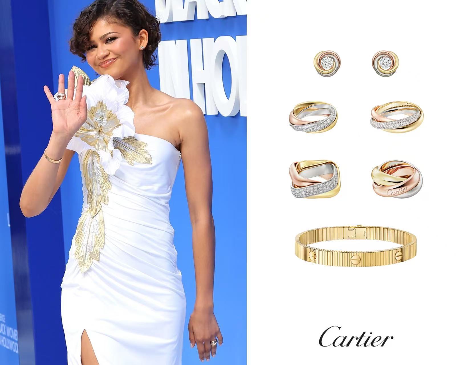 演员赞达亚佩戴卡地亚TRINITY系列戒指、耳环,卡地亚LOVE UNLIMITED手链,出席2026好莱坞黑人女性颁奖典礼。