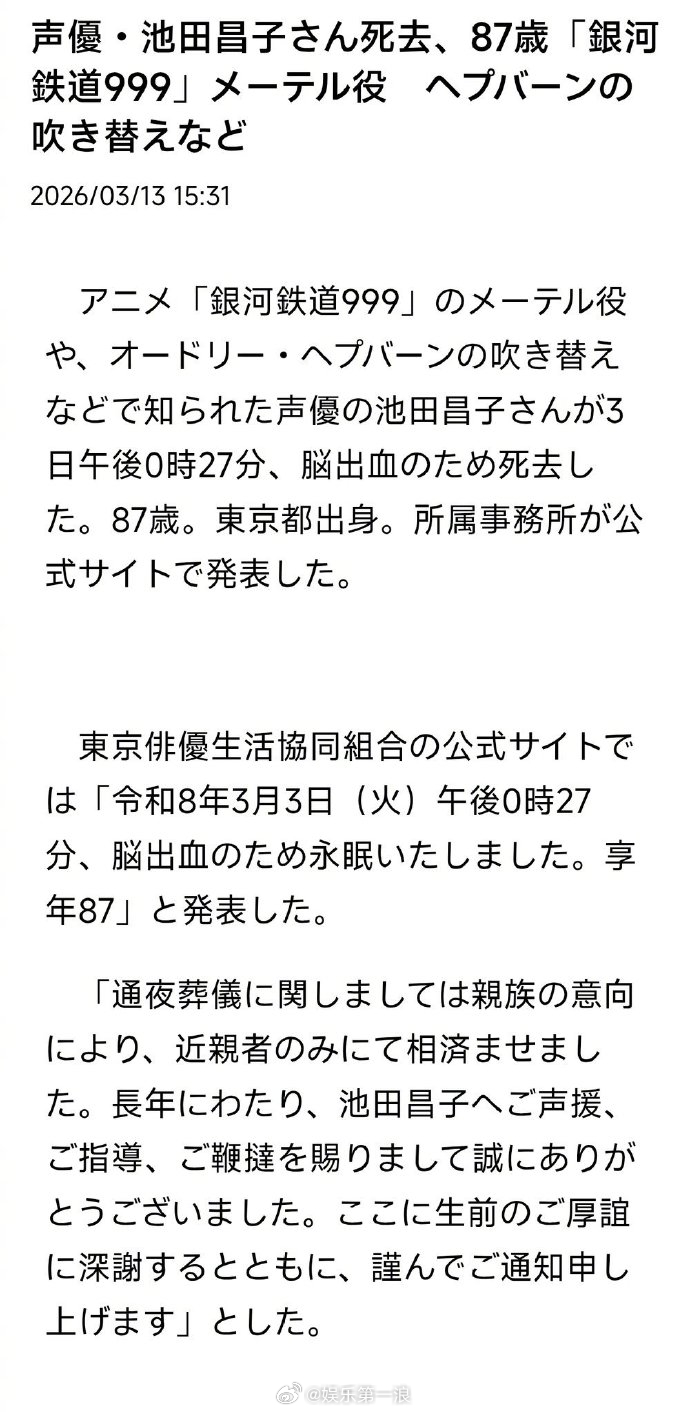 声优池田昌子去世银河铁道999梅蒂尔声优去世 曾为《银河铁道999》梅蒂尔 配音的声优 池田昌子 因脑出血于3月3日去世,享年87岁。