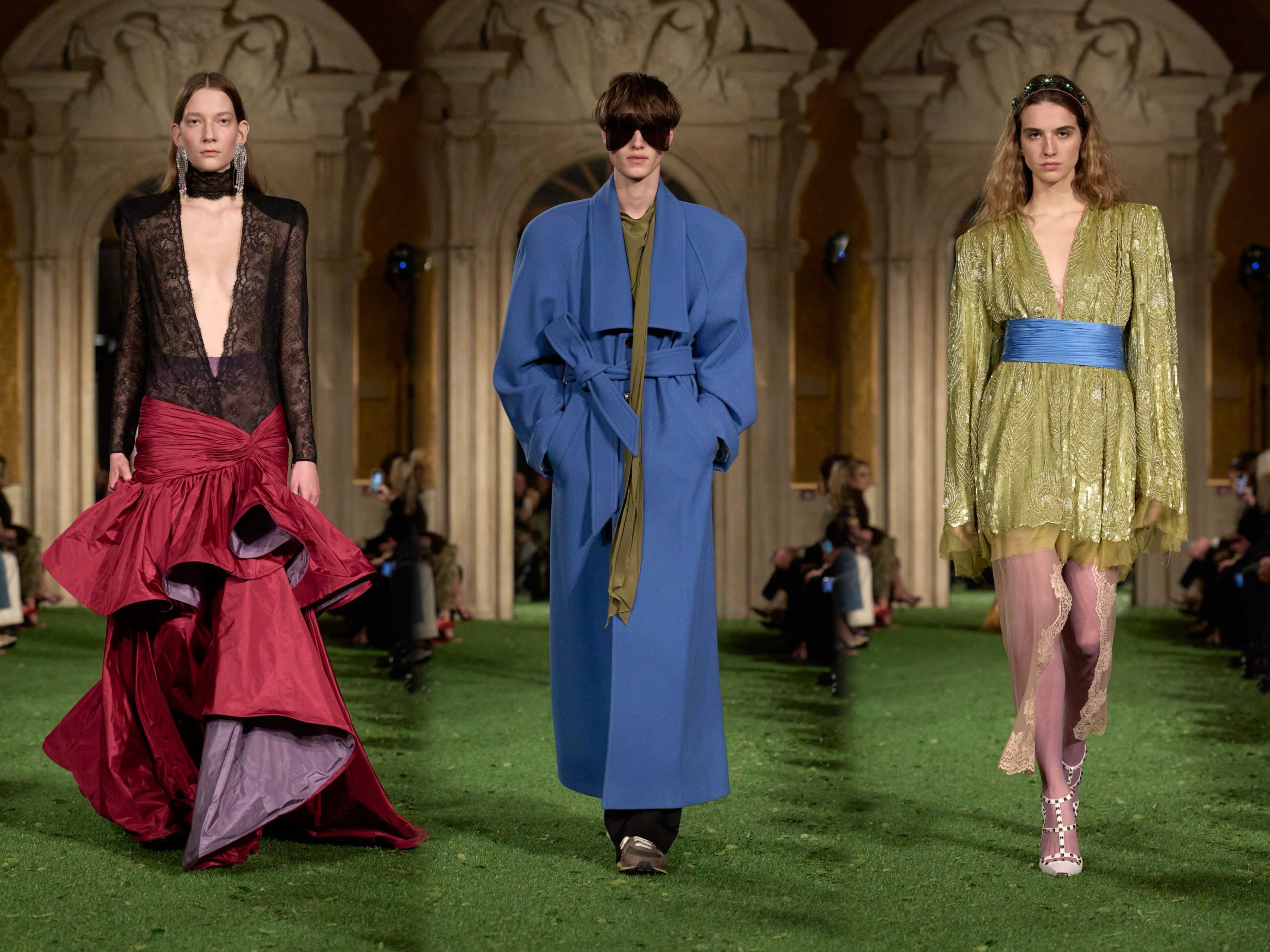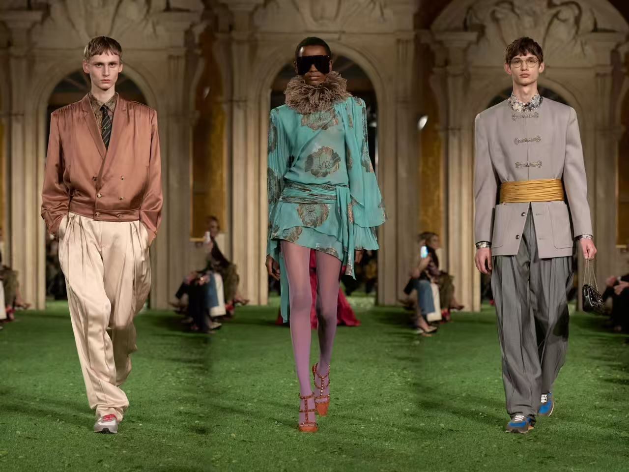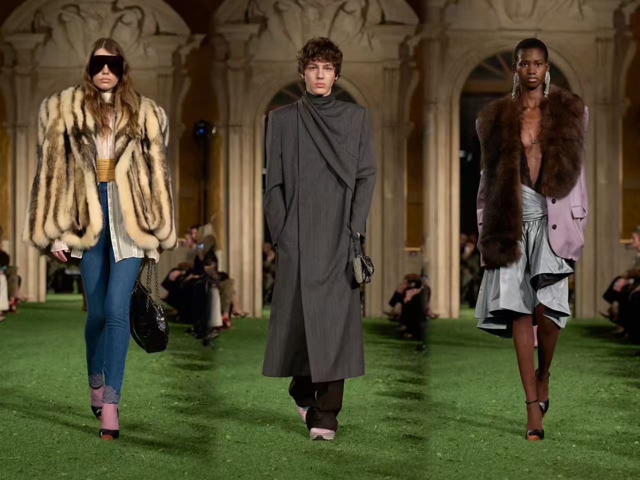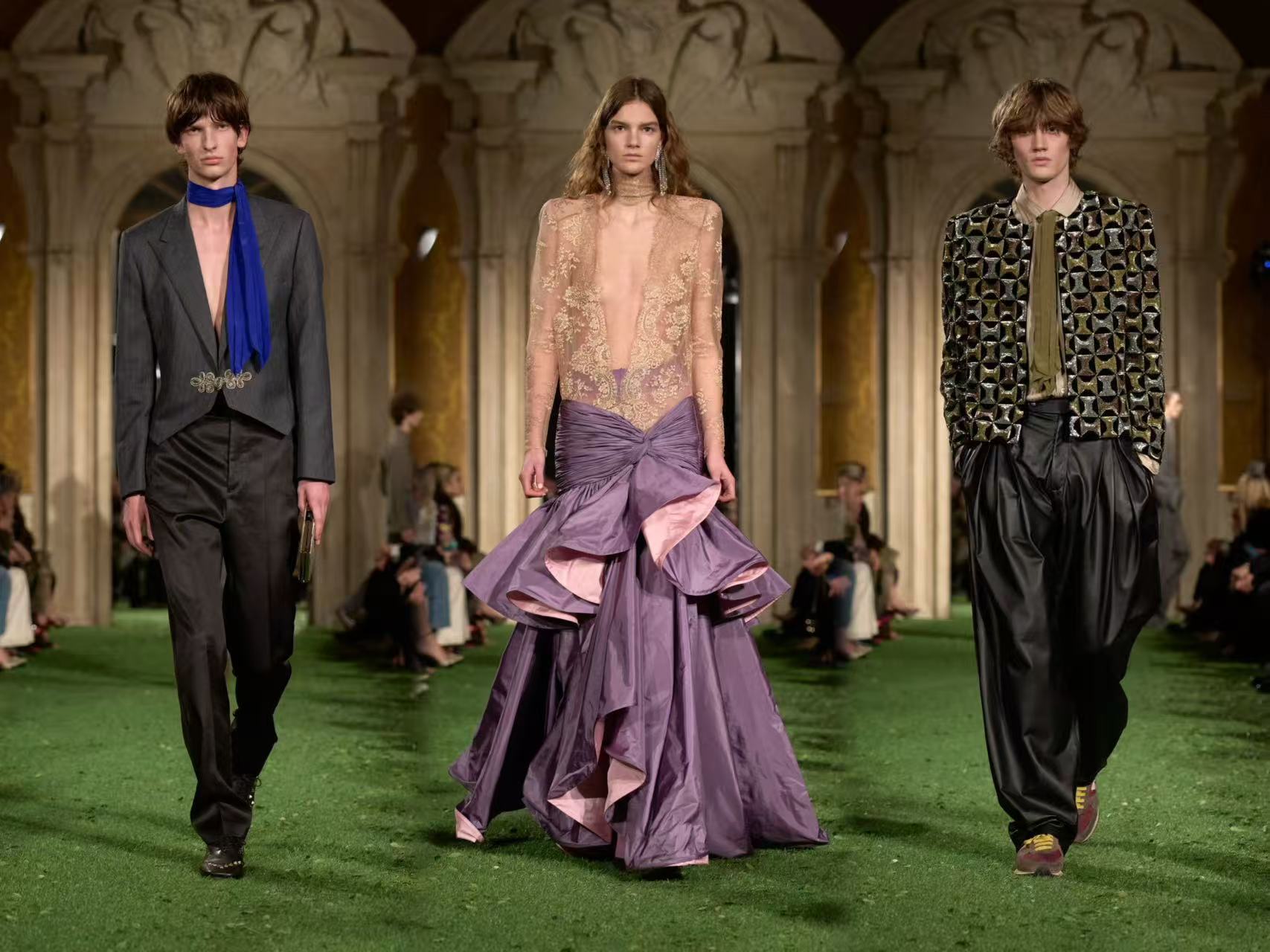 Valentino F/W 2026华伦天奴2026秋冬系列大秀于罗马巴贝里尼宫揭幕,创意总监Alessandro Michele延续对品牌根源的探索,回归品牌诞生地罗马,强调历史传承与艺术联结。本季主题为“INTERFERENZE (交扰共振)”,在巴洛克式空间里展开想象,聚焦古典与现代的碰撞。将“一件服装的构造,如同一座建筑的建造”这一概念,找寻利落廓形与柔婉的织物质感之间,构建出极具张力的视觉平衡。Michele以标志性的极繁主义重构Valentino的美学基调,将毛绒皮草、蕾丝雪纺、薄纱亮片等多种不同质感的面料碰撞,设计中融合蕾丝、褶皱、蝴蝶结等华伦经典元素,剪裁利落的西装大衣,层叠轻盈的纱裙礼服,搭配华丽刺绣与珠宝配饰,铆钉高跟鞋作为品牌的经典符号,也有了焕新演绎,在自信与柔美之间,释放摩登张力,于繁复堆叠之中暗藏理性秩序,在实用性中延续优雅复古风格表达。Valentino2026秋冬系列ValentinoInterferenze 华伦天奴