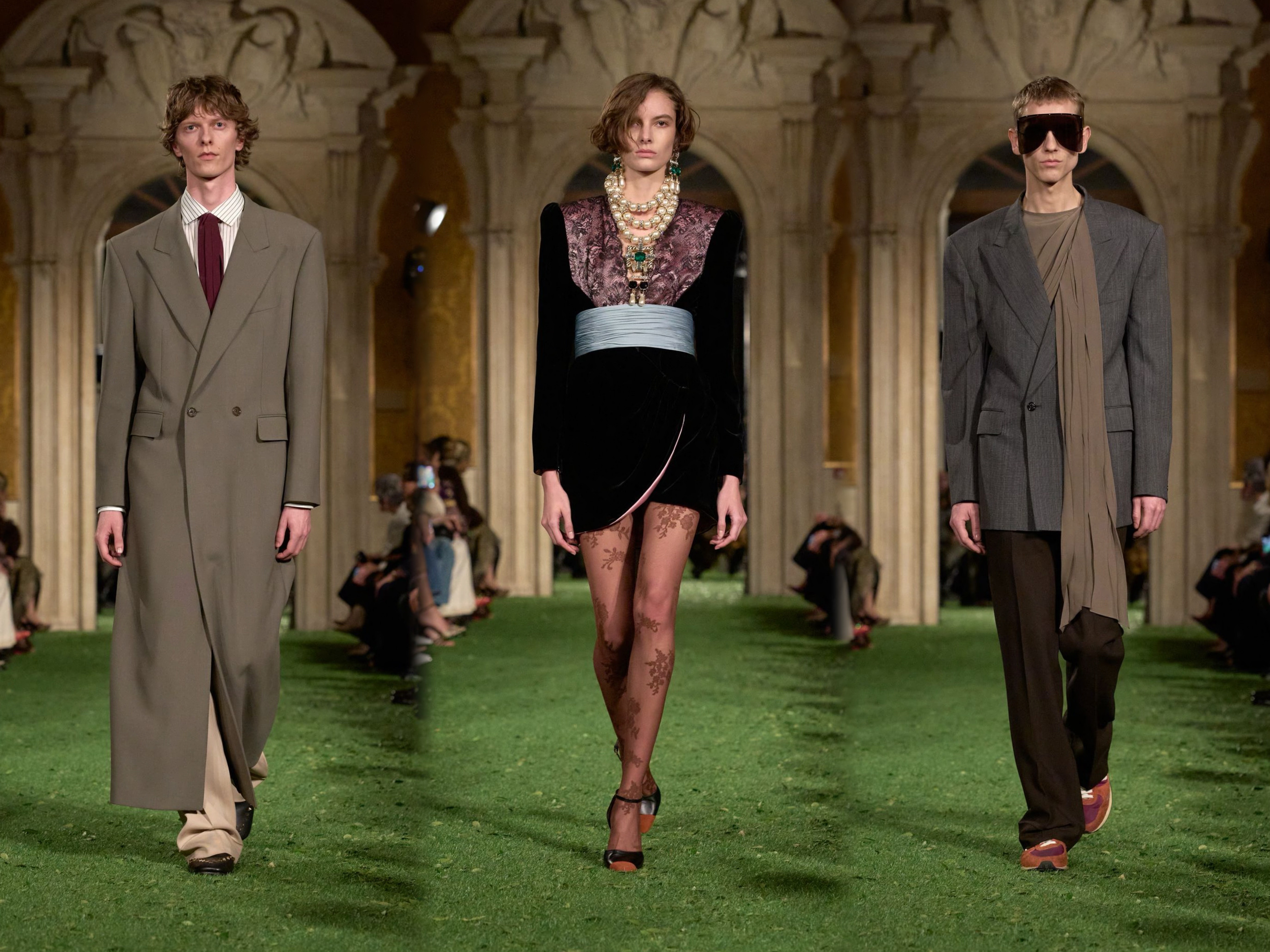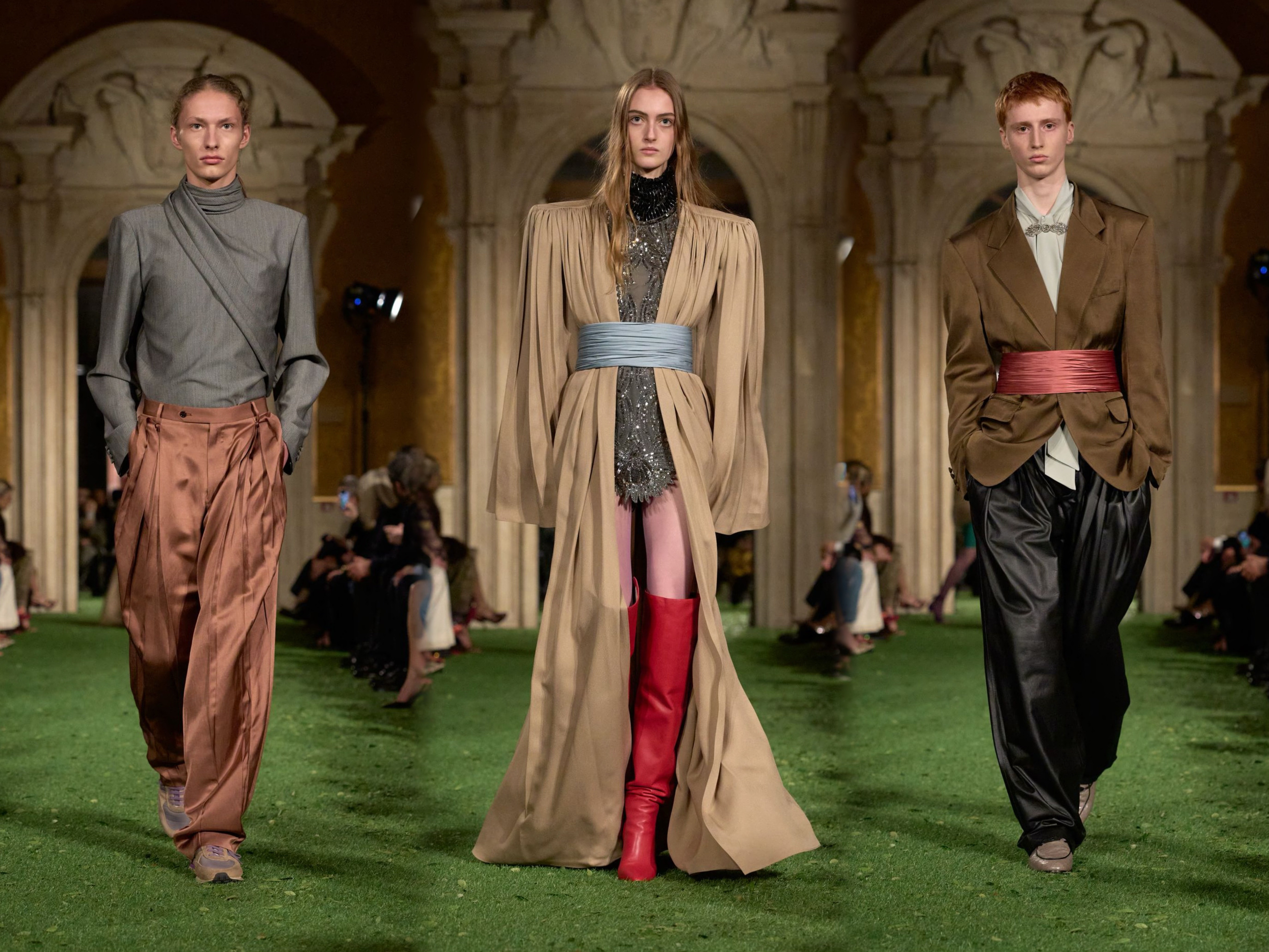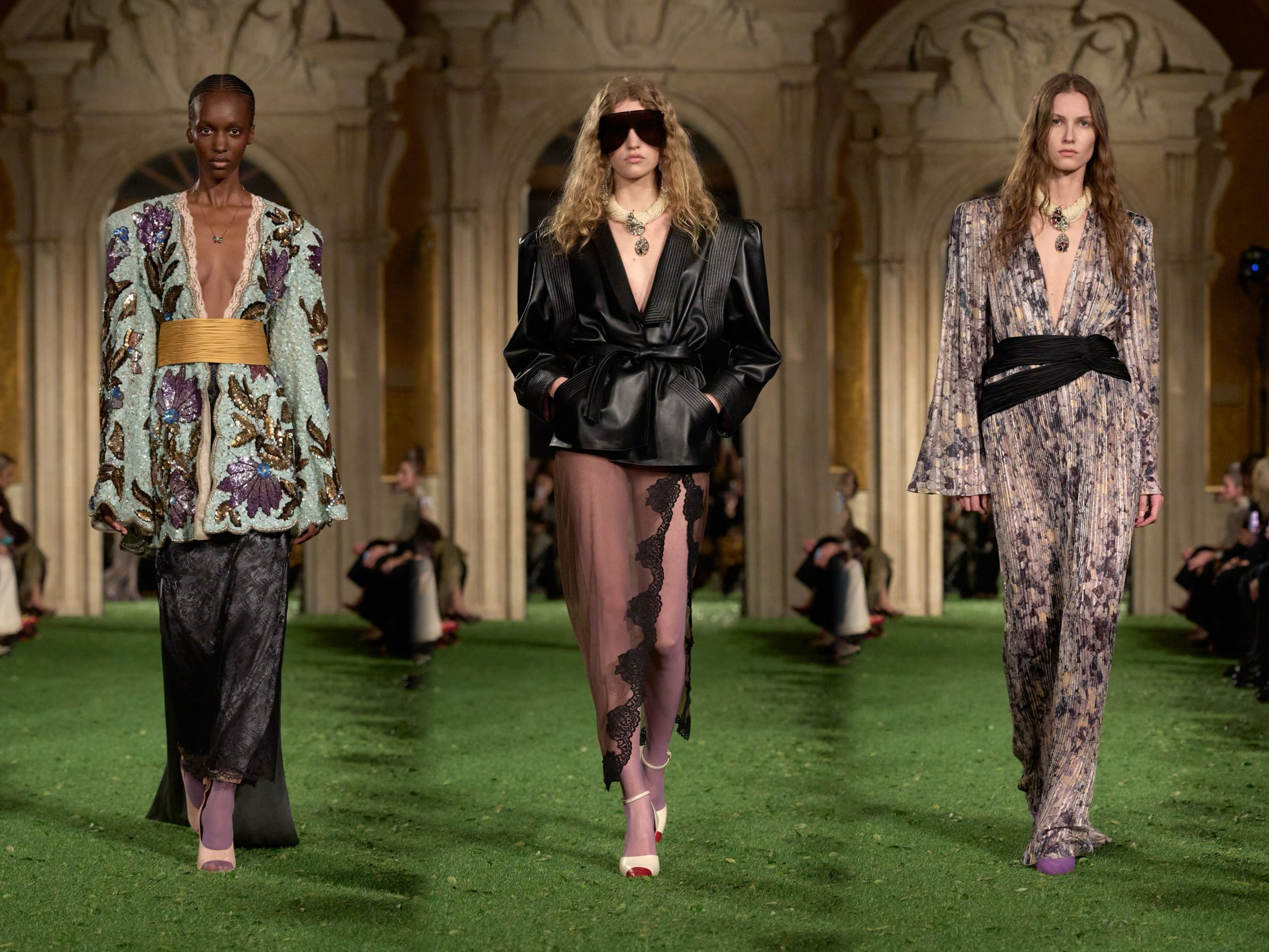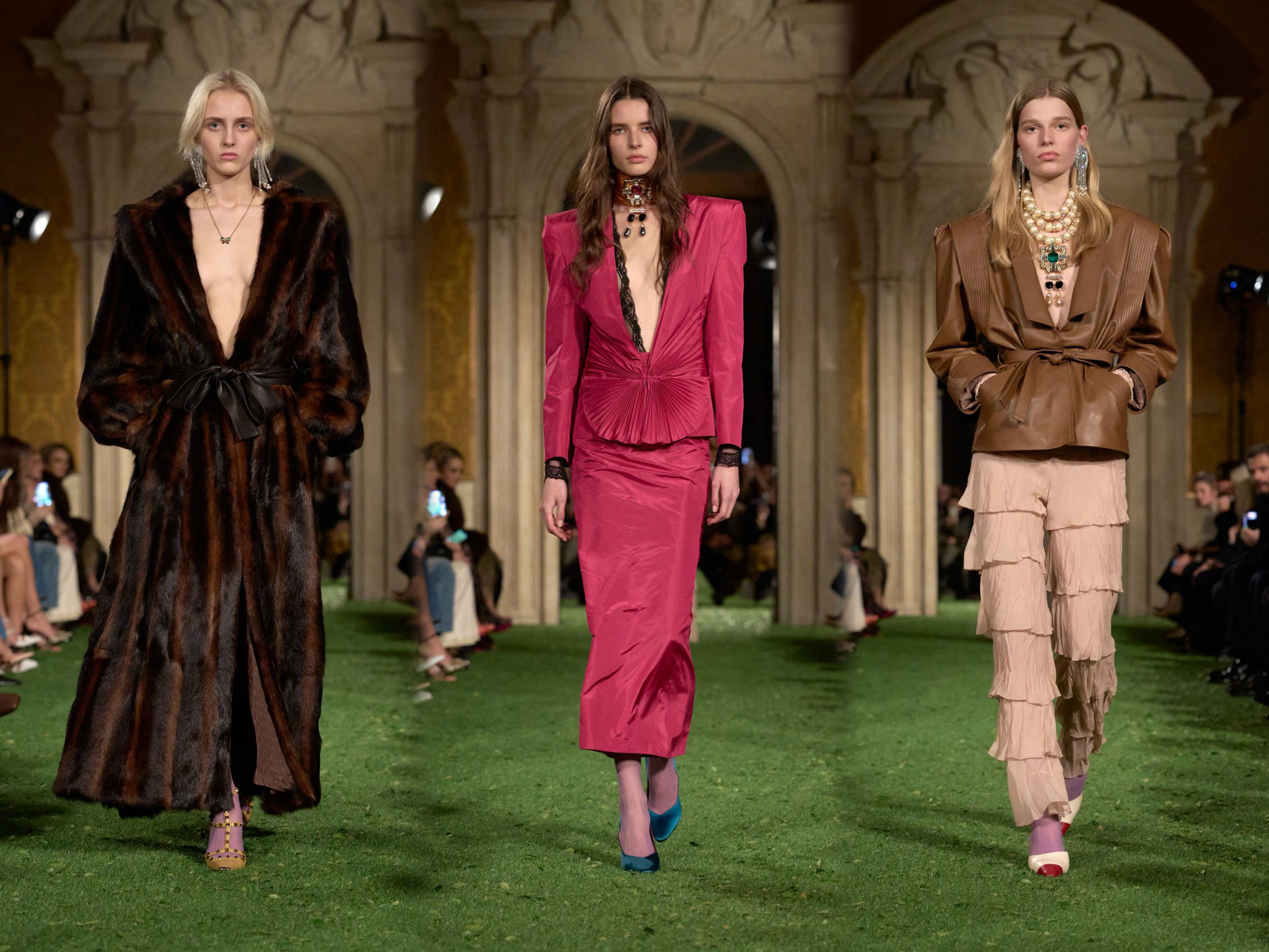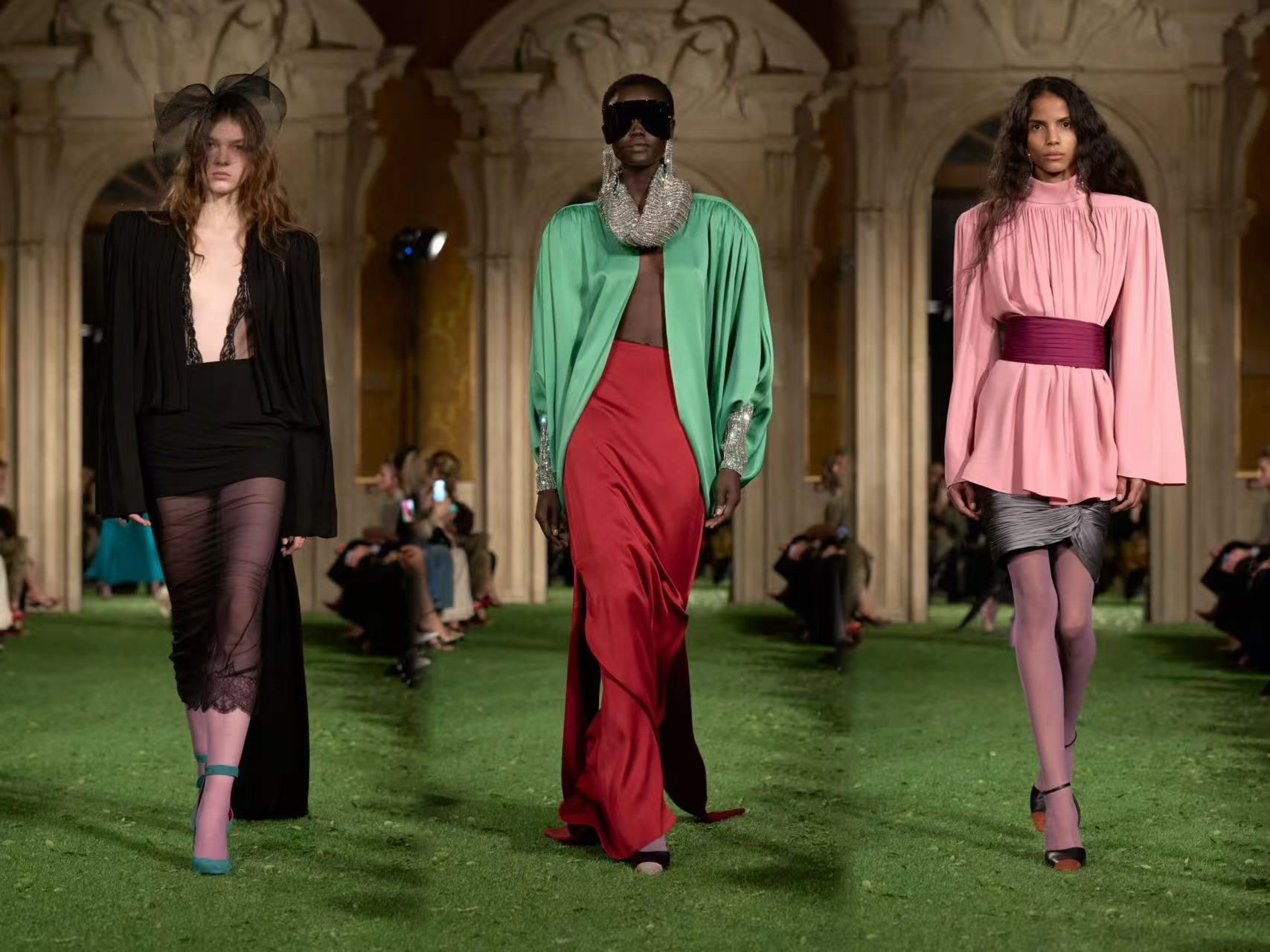 Valentino F/W 2026华伦天奴2026秋冬系列大秀于罗马巴贝里尼宫揭幕,创意总监Alessandro Michele延续对品牌根源的探索,回归品牌诞生地罗马,强调历史传承与艺术联结。本季主题为“INTERFERENZE (交扰共振)”,在巴洛克式空间里展开想象,聚焦古典与现代的碰撞。将“一件服装的构造,如同一座建筑的建造”这一概念,找寻利落廓形与柔婉的织物质感之间,构建出极具张力的视觉平衡。Michele以标志性的极繁主义重构Valentino的美学基调,将毛绒皮草、蕾丝雪纺、薄纱亮片等多种不同质感的面料碰撞,设计中融合蕾丝、褶皱、蝴蝶结等华伦经典元素,剪裁利落的西装大衣,层叠轻盈的纱裙礼服,搭配华丽刺绣与珠宝配饰,铆钉高跟鞋作为品牌的经典符号,也有了焕新演绎,在自信与柔美之间,释放摩登张力,于繁复堆叠之中暗藏理性秩序,在实用性中延续优雅复古风格表达。Valentino2026秋冬系列ValentinoInterferenze 华伦天奴