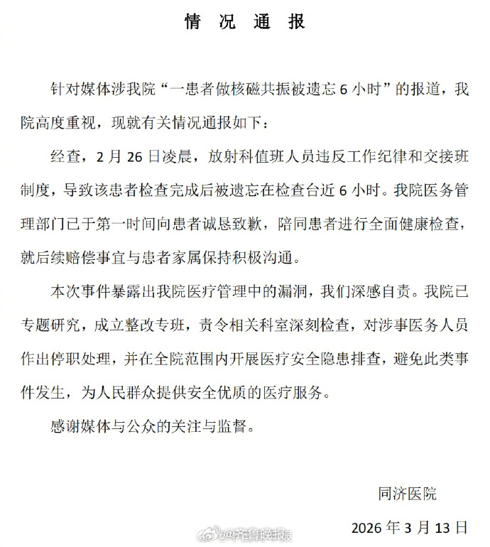 #患者被困核磁共振机暴露管理混乱#【晚报来论 | 患者被困核磁共振仪器6小时,不只是暴露了医院的“健忘症”】#患者被困核磁共振机别想轻易翻篇# 做了一次核磁共振检查,竟然在仪器里被困了6个小时。近日,武汉市民唐先生的这一经历,引发广泛关注。3月13日,华中科技大学同济医学院附属同济医院针对此事发布情况通报,承认事件属实,向唐先生诚恳致歉,称医院放射科值班人员违反了工作纪律和交接班制度。目前,医院已成立整改专班,责令相关科室深刻检查,对涉事医务人员作出停职处理。