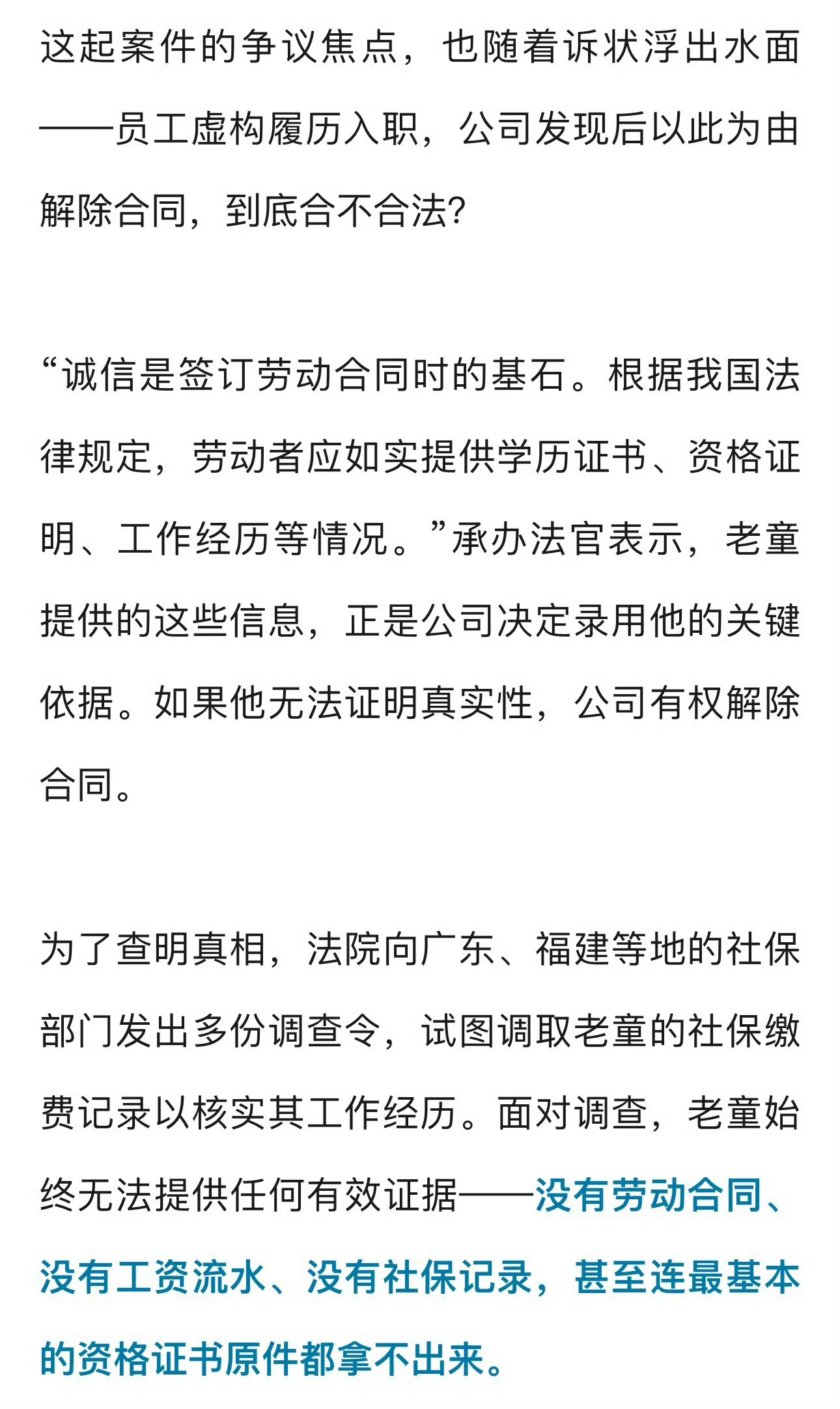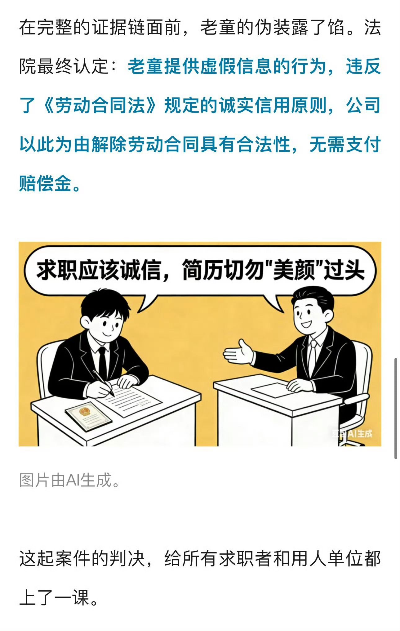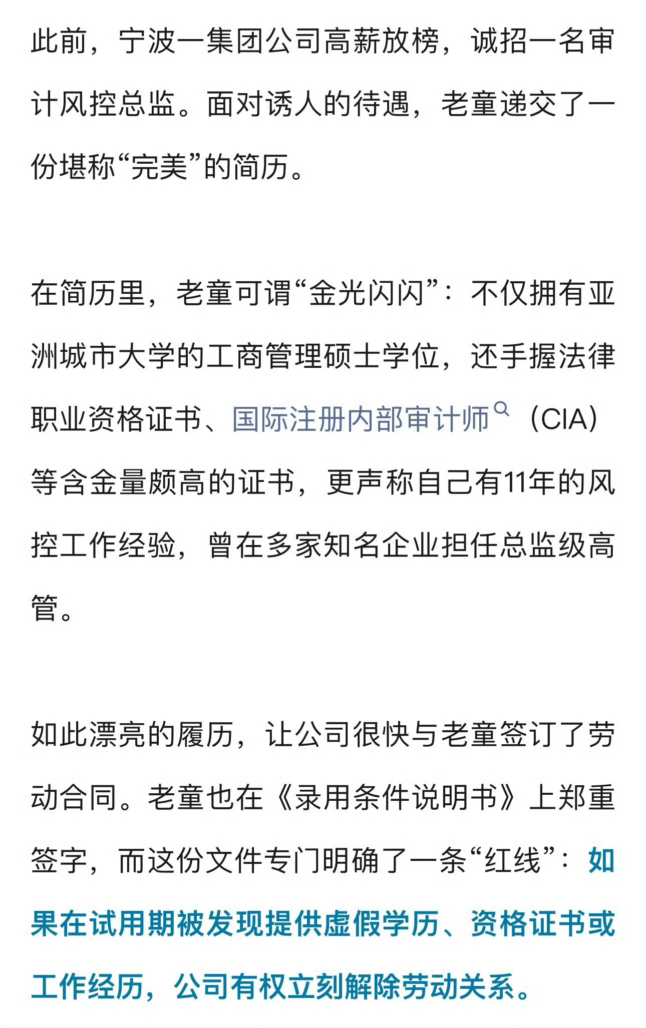 宁波一男子造假完美简历暴露被辞退法院判了 ,合法解雇,无需支付赔偿金宁波一公司高薪招聘总监,男子造假“完美”简历被录取,被公司发现后以“无法证明符合录用条件”为由辞退法院:合法解雇,无需赔偿