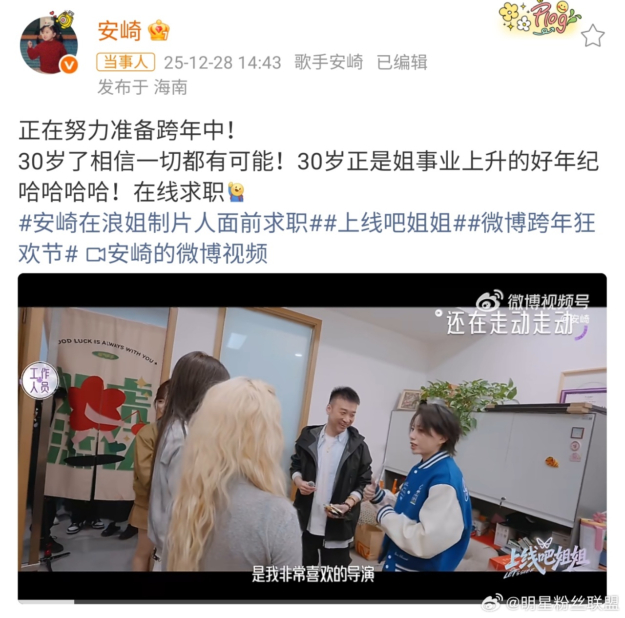 安崎求职浪姐真的成功了 谁狠狠泪目了!当初勇敢自荐的,真的把机会握在了自己手里!从跨年到元宵再到浪姐,每一步都走得踏实又耀眼!乘风2026