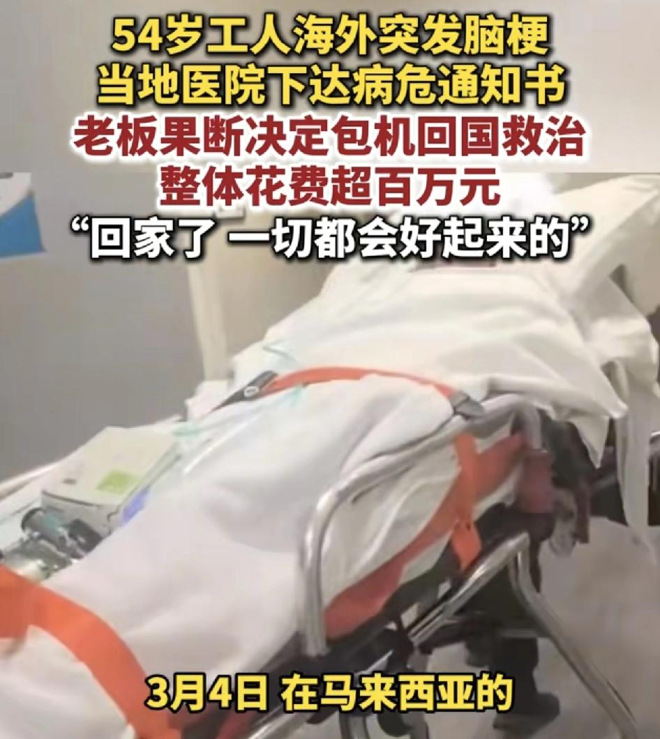 马来西亚一位54岁的工人突发脑梗被紧急送往当地医院救治,医院下达病危通知书,国内的老板迅速作出决定,包机回国,老板联系上了上海一家航空公司,辗转回到武汉医院经过治疗病情趋于稳定。目前已经神经内科。整体花费百万,老板纷纷被网友点赞,太仁义了,老板却说回到家一切都会好起来的。