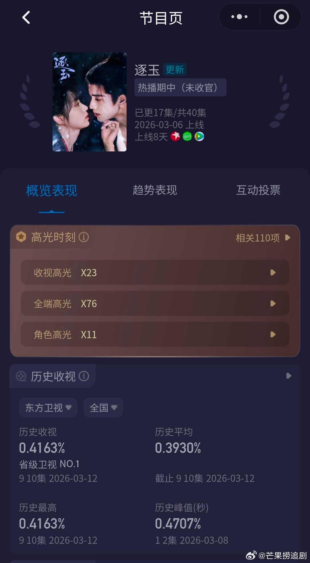 《逐玉》云合日榜七连冠,年榜已来到第九位,占比超43.7%,酷云日榜六连冠,收视率历史平均(暂)0.3930%!