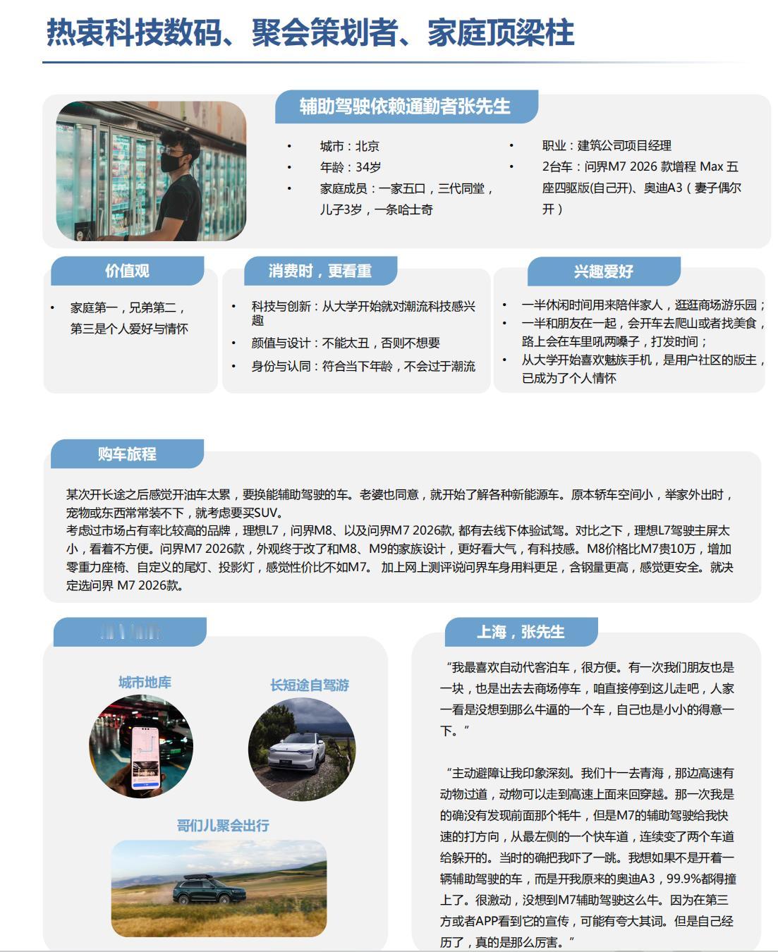 从全新问界M7车主画像,读懂当代品质家庭生活新主张 新鲜出炉的全新问界M7车主调研报告,展现出当代品质家庭清晰的生活观念与出行态度。这类用户热爱前沿科技,乐于将智能配置融入日常出行,全新问界M7的智能设计,成为他们科技生活的重要延伸。他们始终以家庭为核心,购车决策围绕亲子陪伴与全家出行展开,车辆成为承载家庭温暖的移动空间。 同时他们注重工作与生活的平衡,偏爱露营、探店、短途自驾等休闲社交方式,多元场景需求都能在这款车上得到满足。此外,用户对质感美学与品质消费有更高要求,全新问界M7的外观内饰设计,也精准契合他们的审美标准。车与生活深度共生,这也是它能打动年轻高知家庭的关键。