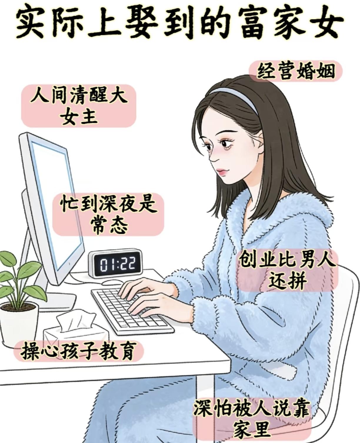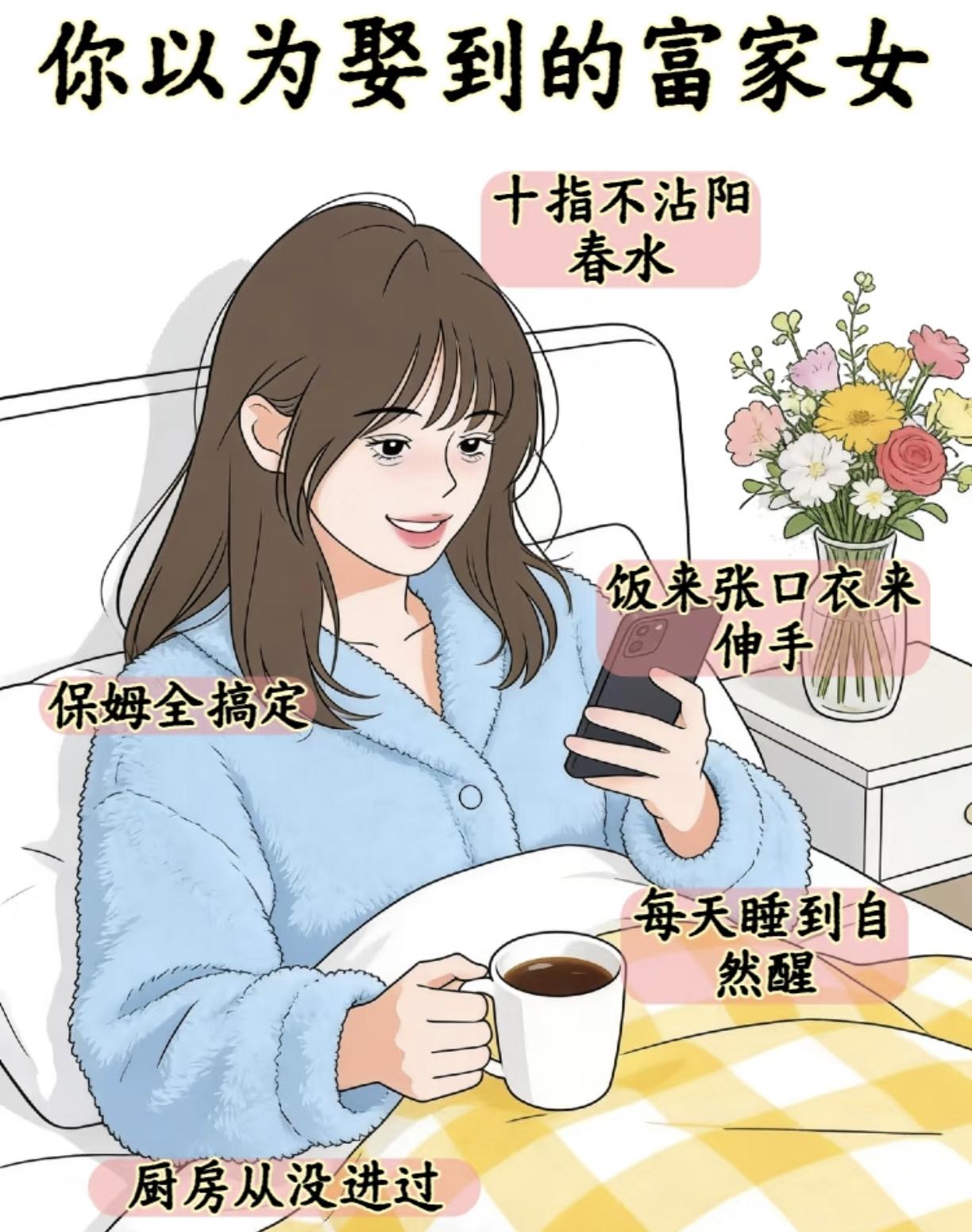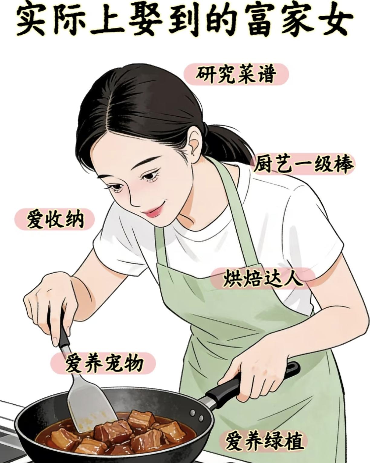 你以为娶到的富家女VS实际上娶到的富家女,看完笑不活了!😂 你以为的富家女: - 每天穿梭高端局,上班只是体验生活 ​ - 十指不沾阳春水,饭来张口衣来伸手,保姆搞定一切 ​ - 朋友圈非富即贵,连亲戚都带着势利眼 ​ - 厨房从没进过,每天睡到自然醒 实际上的富家女: - 人间清醒大女主,创业比男人还拼,忙到深夜是常态 ​ - 操心孩子教育、用心经营婚姻,深怕被说“靠家里” ​ - 厨艺一级棒,研究菜谱、烘焙达人,家里收纳得井井有条 ​ - 爱养宠物、爱种绿植,把日子过成了烟火气满满的小确幸 原来真正的富家女,从来不是娇生惯养的大小姐,而是拎得清、干得好、把生活和事业都攥在手里的大女主! 娶到这样的富家女,到底是赚了还是“赚了”?