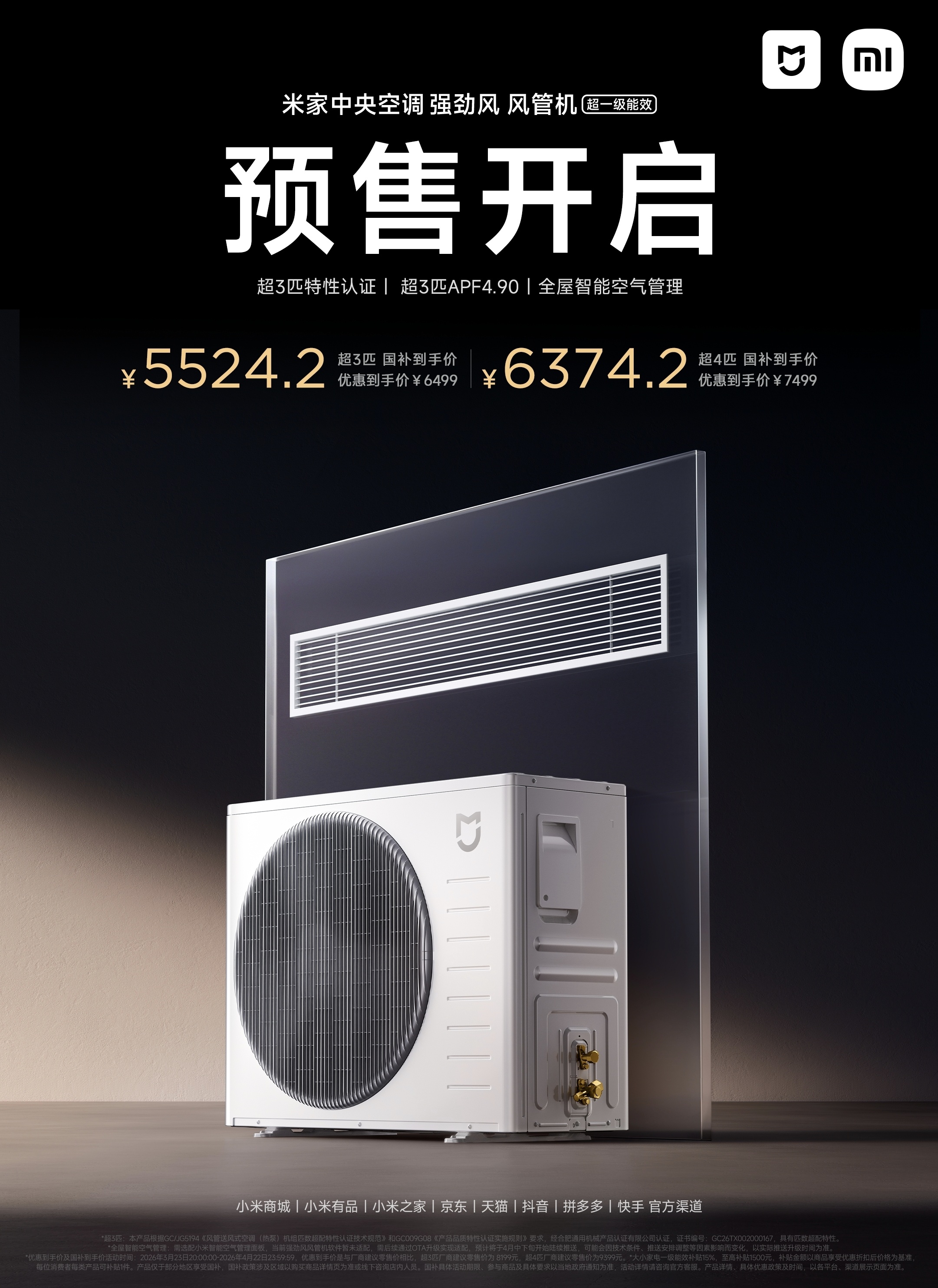 小米全新强劲风风管机,5K多拿下,太猛了哈!超3匹性能,大功率速冷速热,三洋25cc双转子压缩机与纯铜大换热器,支持小米全生态智能空气管理,人感控风+OTA升级,超一级能效超省电。