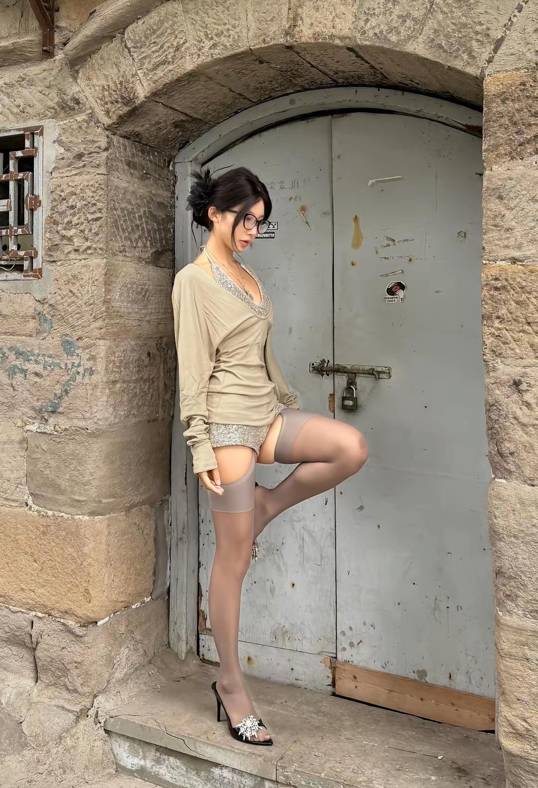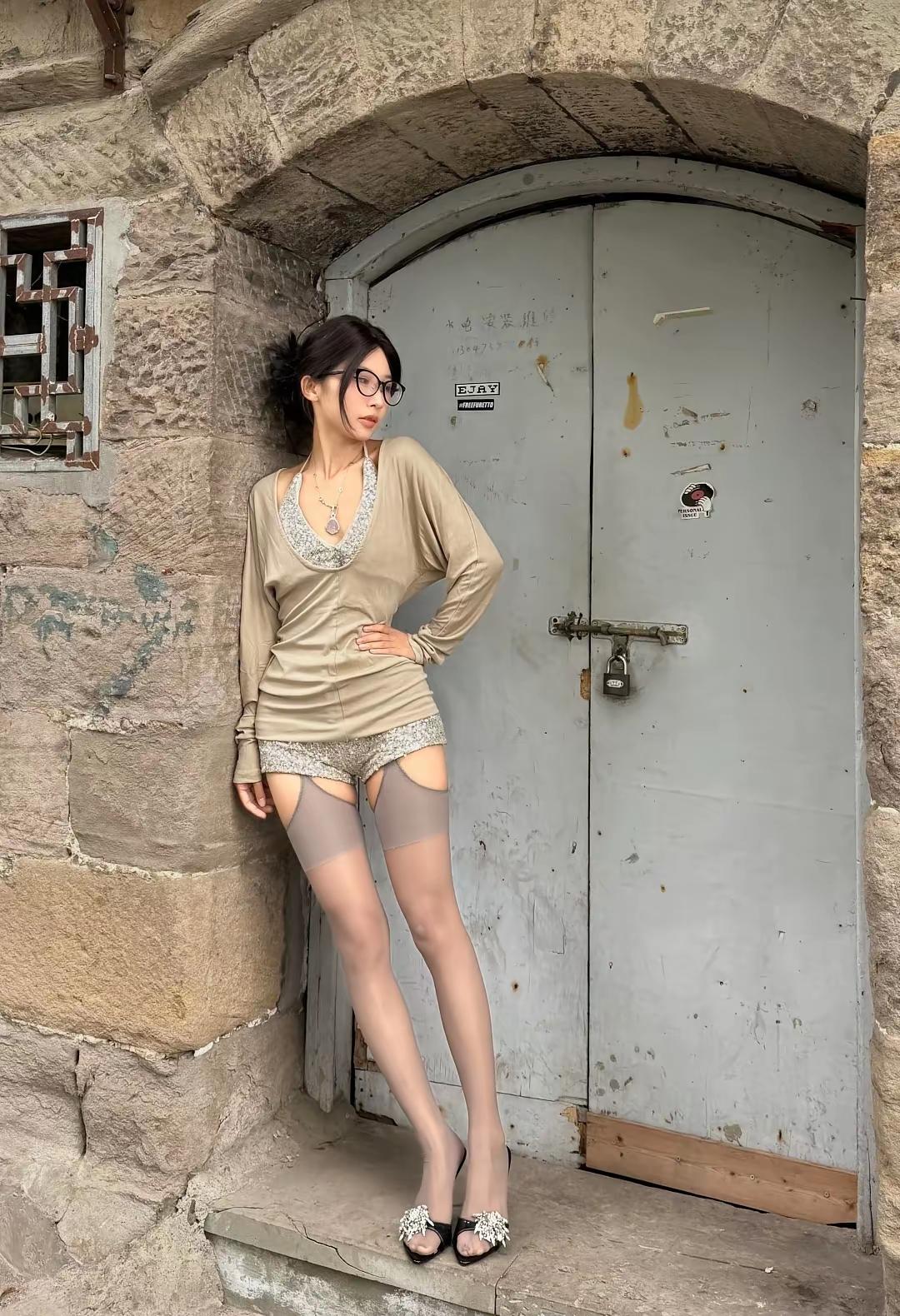 复古风穿搭,优雅气质,黑白配高跟鞋,时尚眼镜,石阶上的静谧时光。