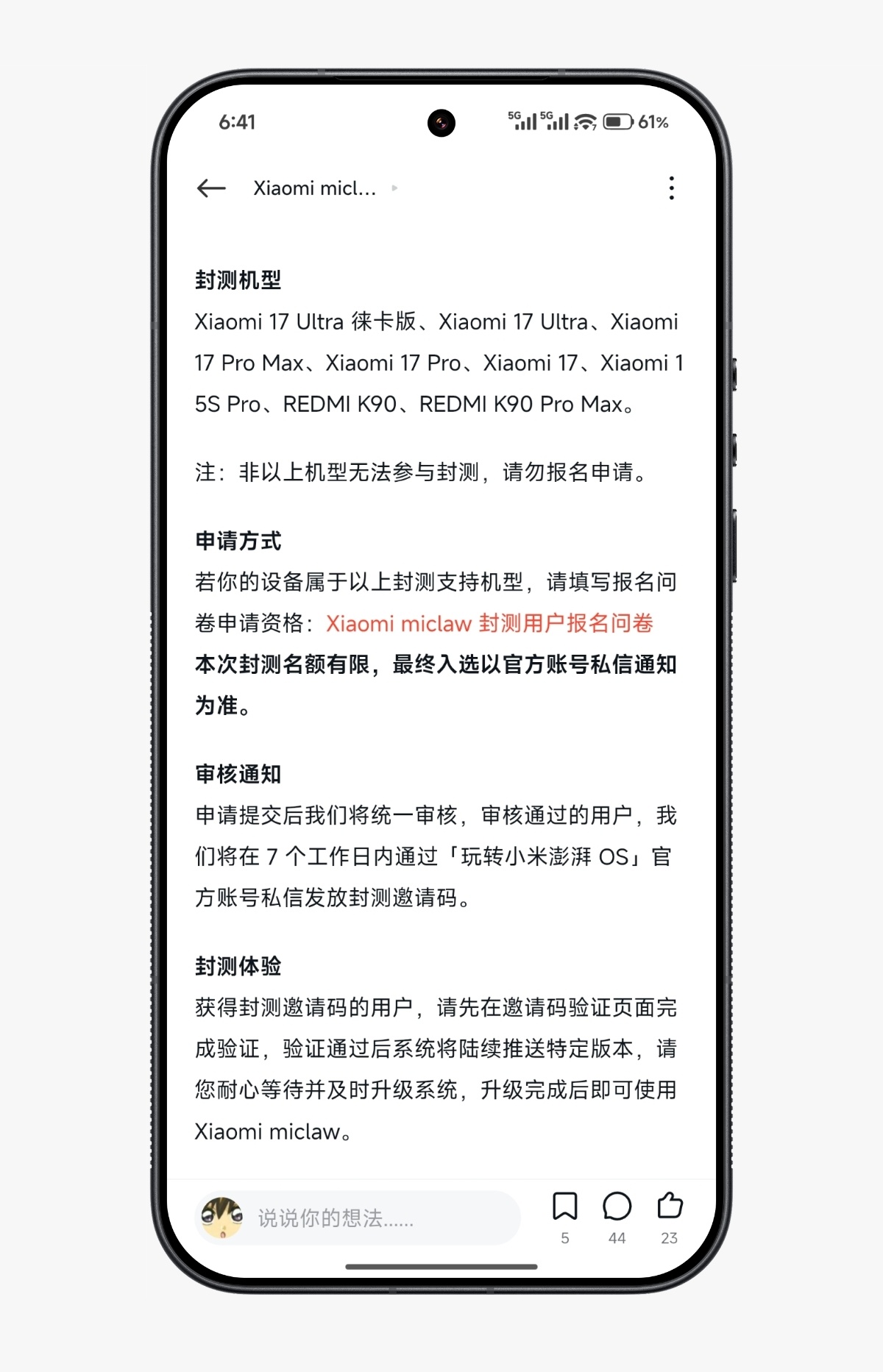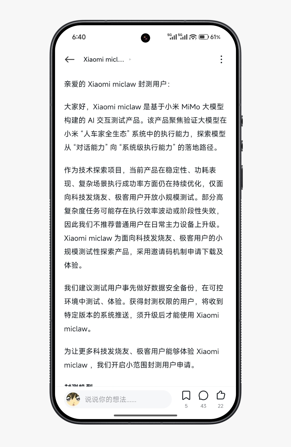小米澎湃OS3 小米官方开启Xiaomi miclaw 封测申请,名额有限,感兴趣的小伙伴赶紧申请吧。