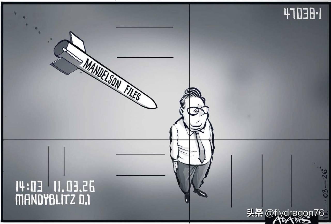 与《泰晤士报》的漫画家们不同——后者认为,曼德尔森与爱泼斯坦的相关档案不过是为了转移人们对斯塔默在军事领域失职这一批评的注意力——《每日电讯报》的同行们则坚称,这些“曼德尔森档案”对斯塔默的打击力度,丝毫不亚于美国导弹轰炸伊朗平民。